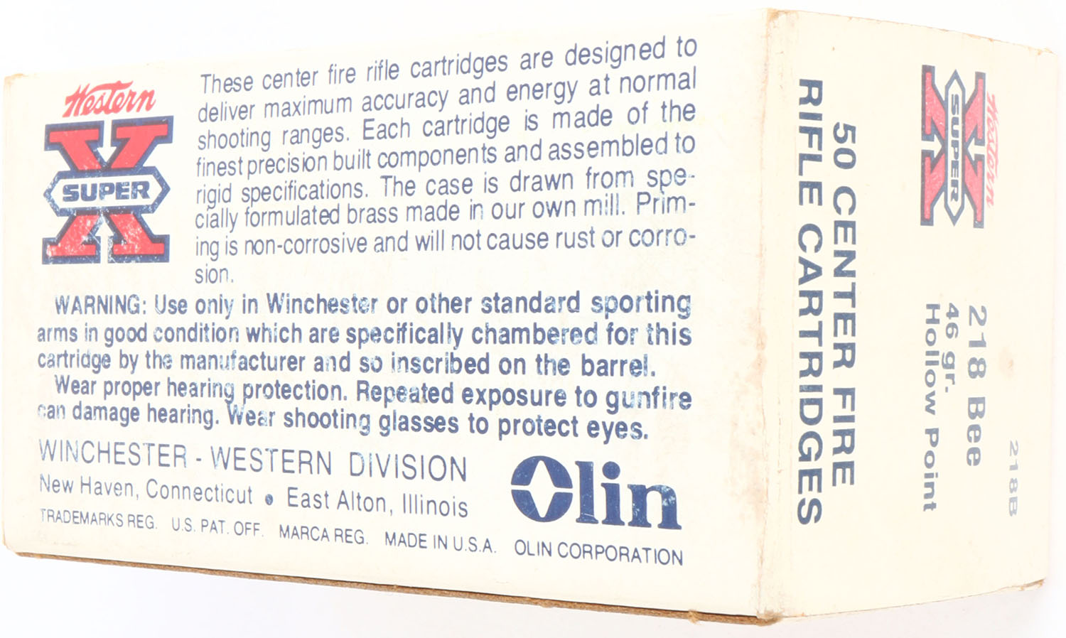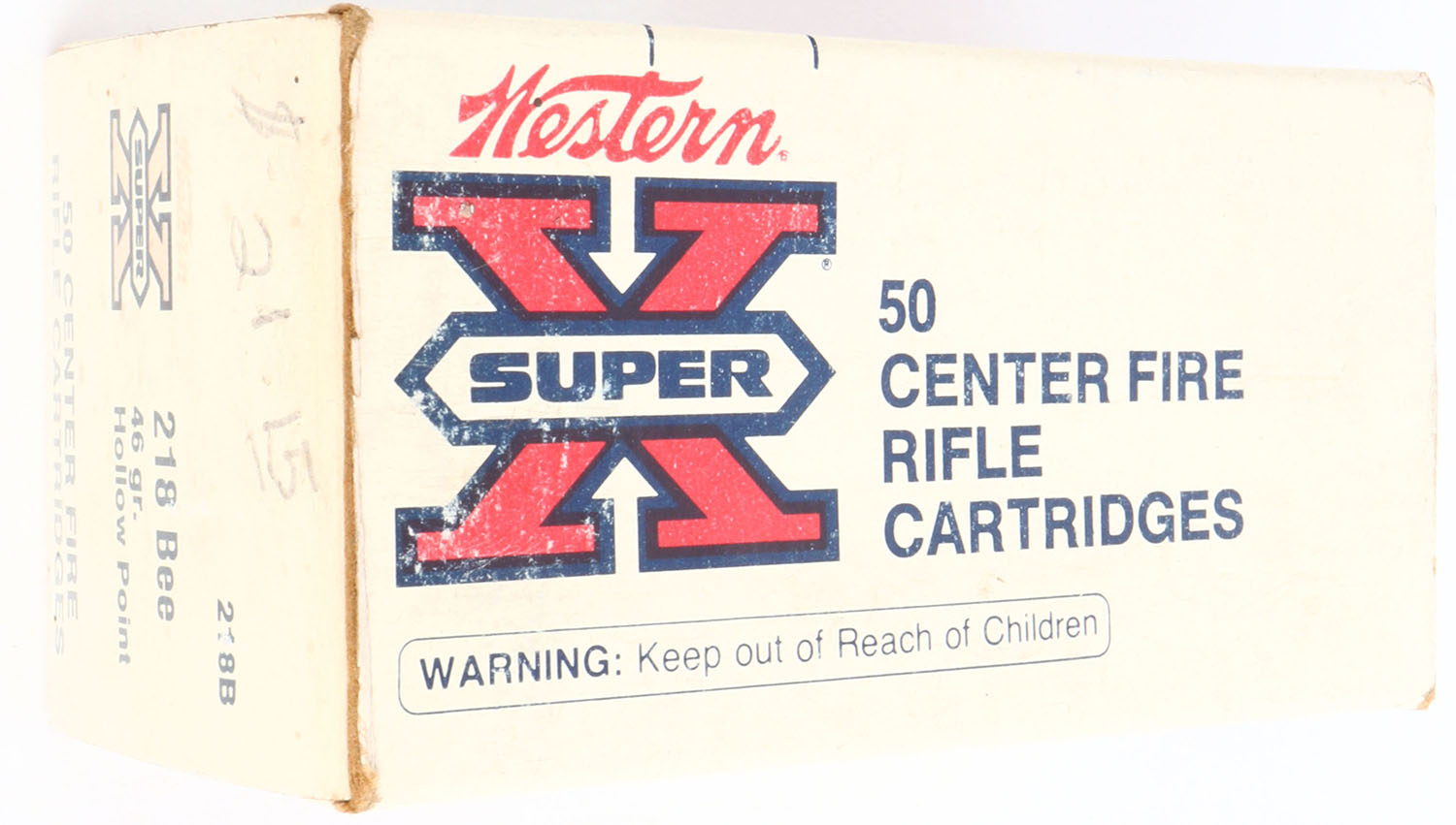 Western, Super-X, .218 Bee, 46 Grain Hollow Point, Full, 1pc. White & red box, box is solid with very good to excellent color, minor age soiling, very minor shelf wear, left end has been written on, very minor corner wear, edges are crisp, end flaps are solid, ammo is excellent. Grade: Excellent - Value: 50 to 150