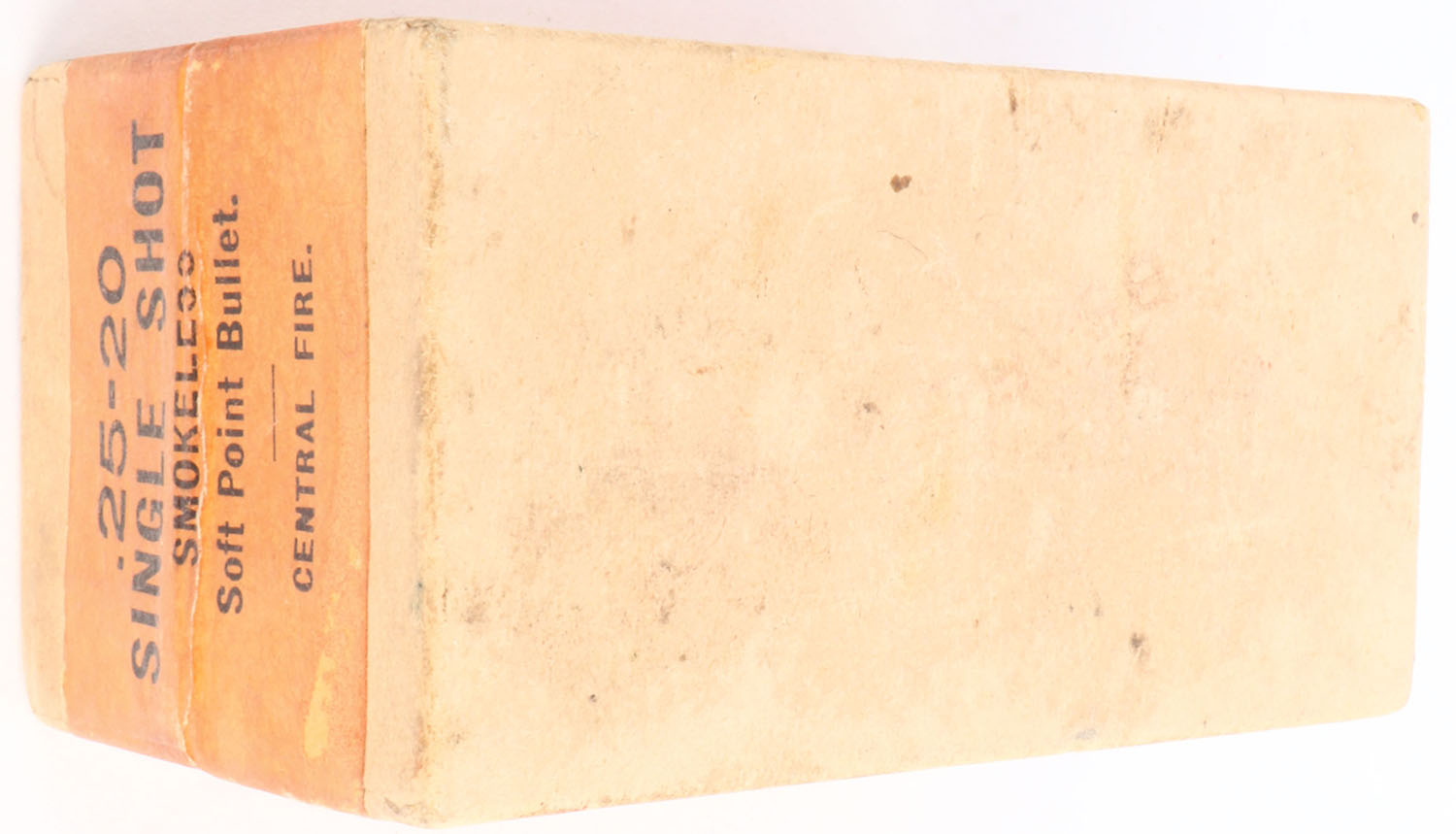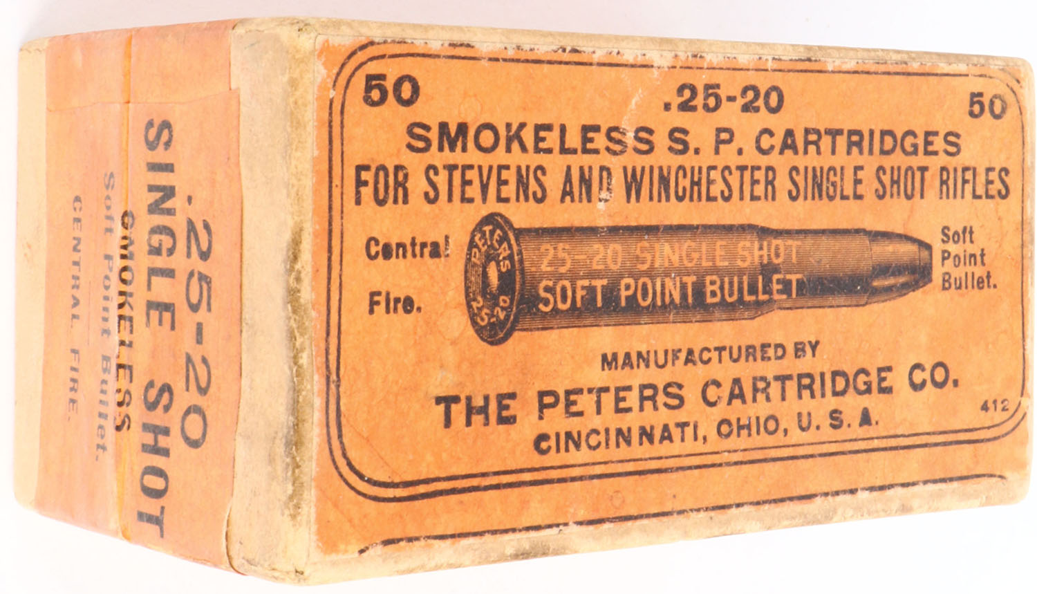 Peters, Smokeless S.P. Cartridges, .25-20 Single Shot, Soft Point Bullets, FULL & SEALED, 2pc. Buff box with orange top & side sealing labels, box is solid with excellent color, minor age soiling, minor edge & corner wear, labels are intact. Grade: Excellent + - Value: 50 to 150