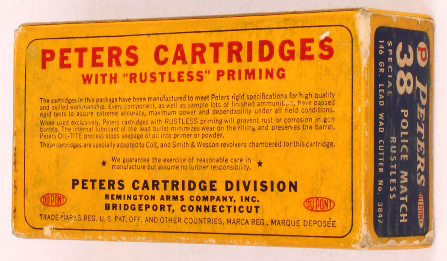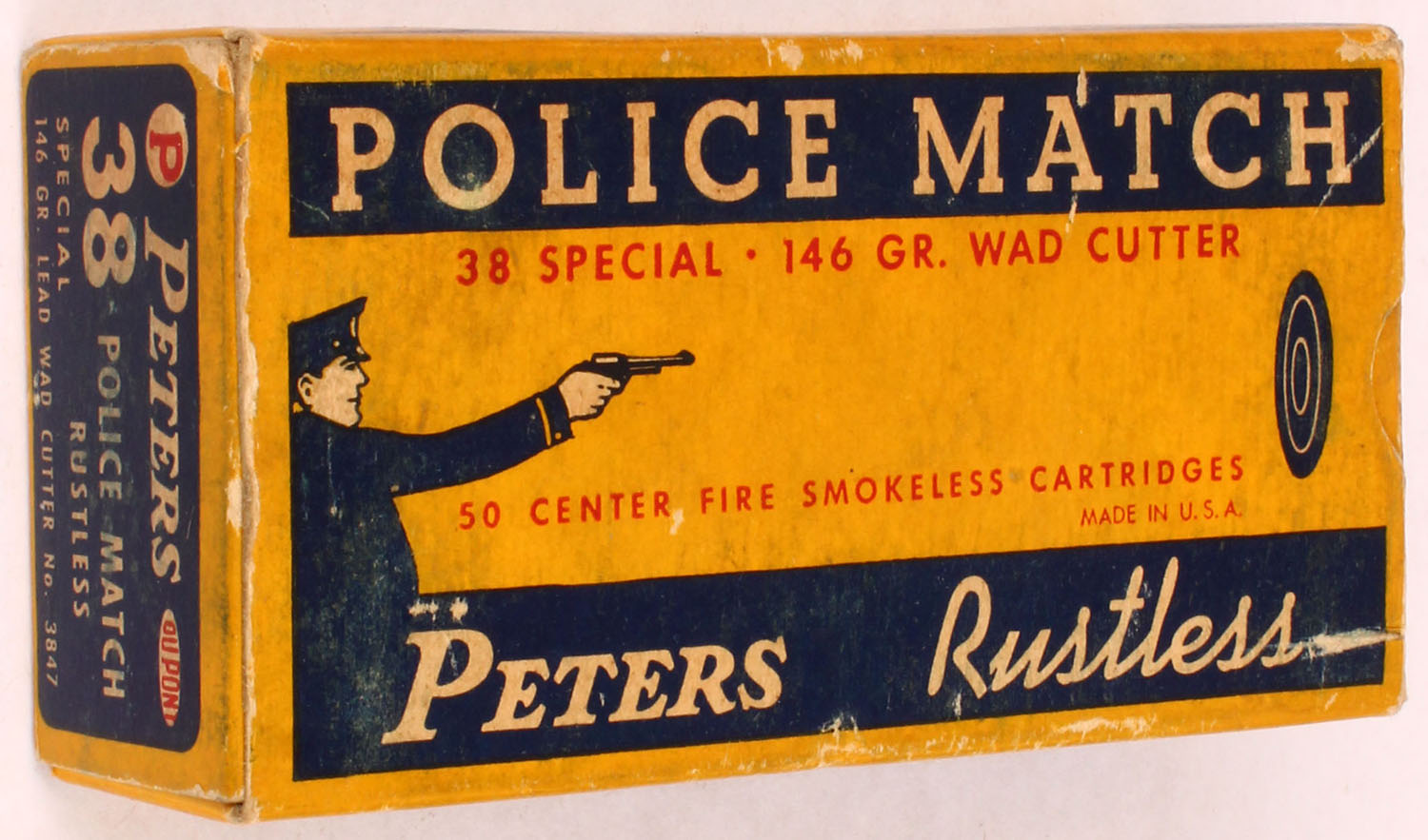 Peters, Police Match, .38 Special, 146 Grain Lead Wad Cutter, Partial 49rds. 1pc. Yellow blue & white box, box is solid with very good to excellent color, some age soiling & shelf wear, minor corner wear, very minor edge wear, end flaps are solid, ammo is excellent. Grade: Excellent - Value: 20 to 60