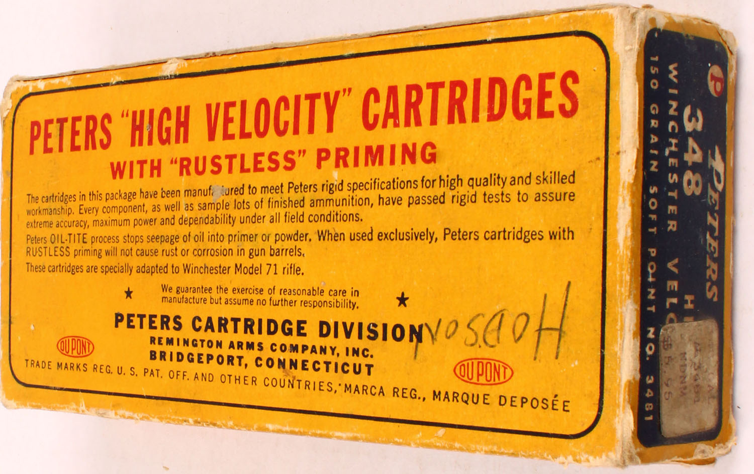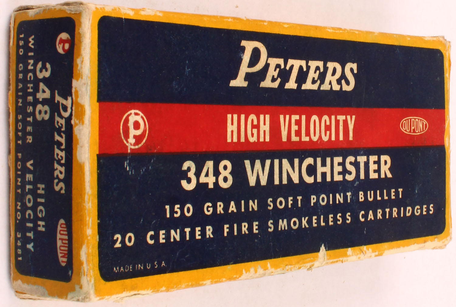 Peters, High Velocity, .348 Winchester, 150 Grain Soft Point Bullet, Full, 1pc. Blue & yellow box, box is solid with excellent color, very minor shelf wear, edge & corner wear, end flaps are solid, ammo is excellent,. Grade: Excellent - Value: 40 to 120