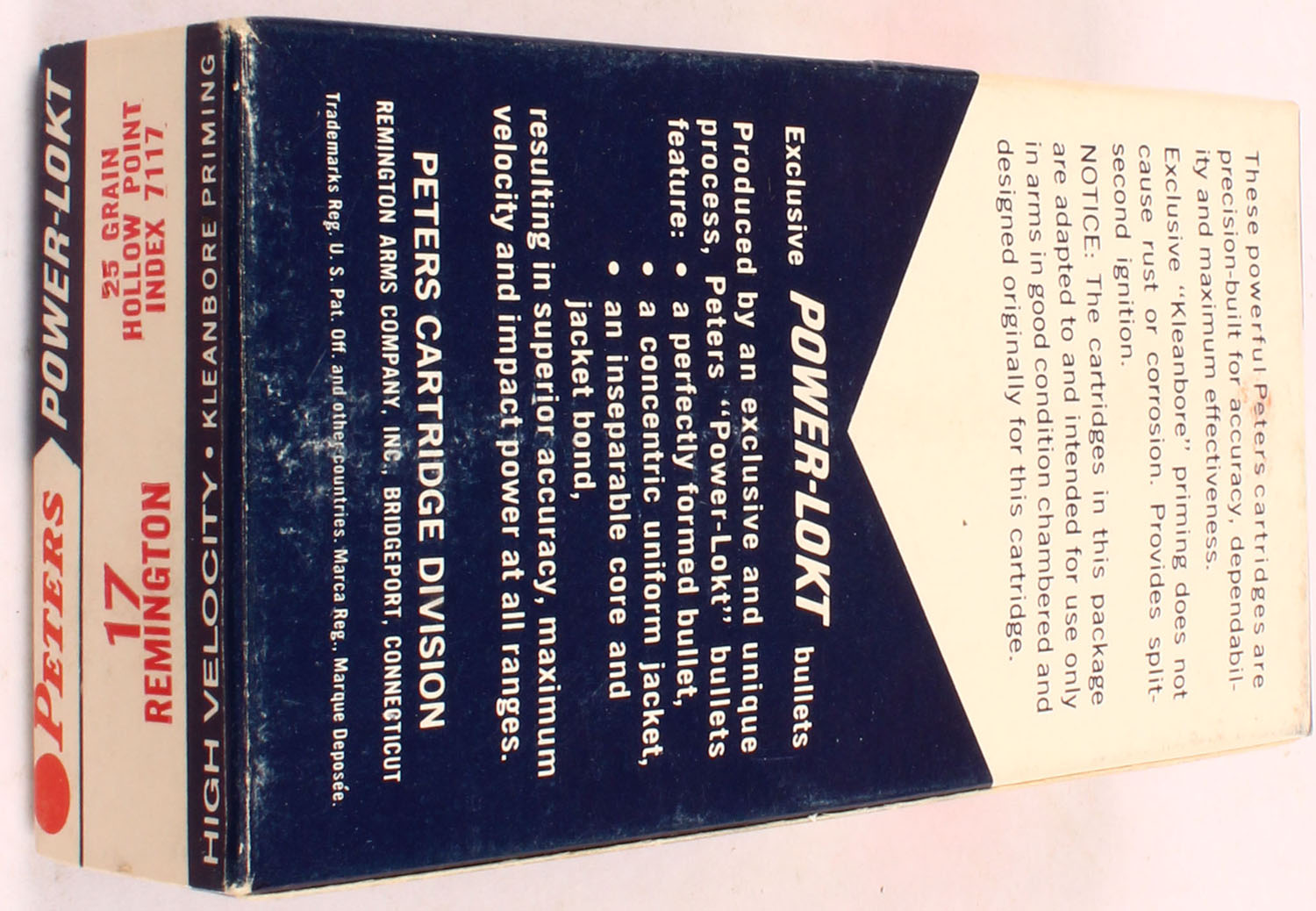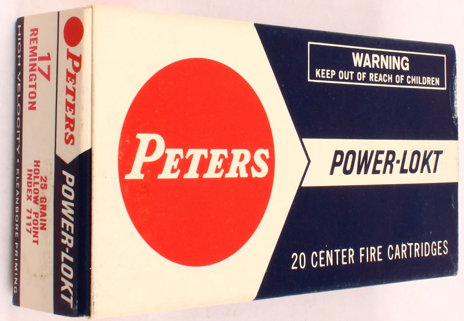 Peters, Power-Lokt, .17 Remington, 25 Grain Hollow Point, Full, 1pc. Blue white & red box, box is solid with excellent color, corners are sharp, edges are mostly crisp, end flaps are solid, ammo is excellent. Grade: Excellent ++ - Value: 20 to 60