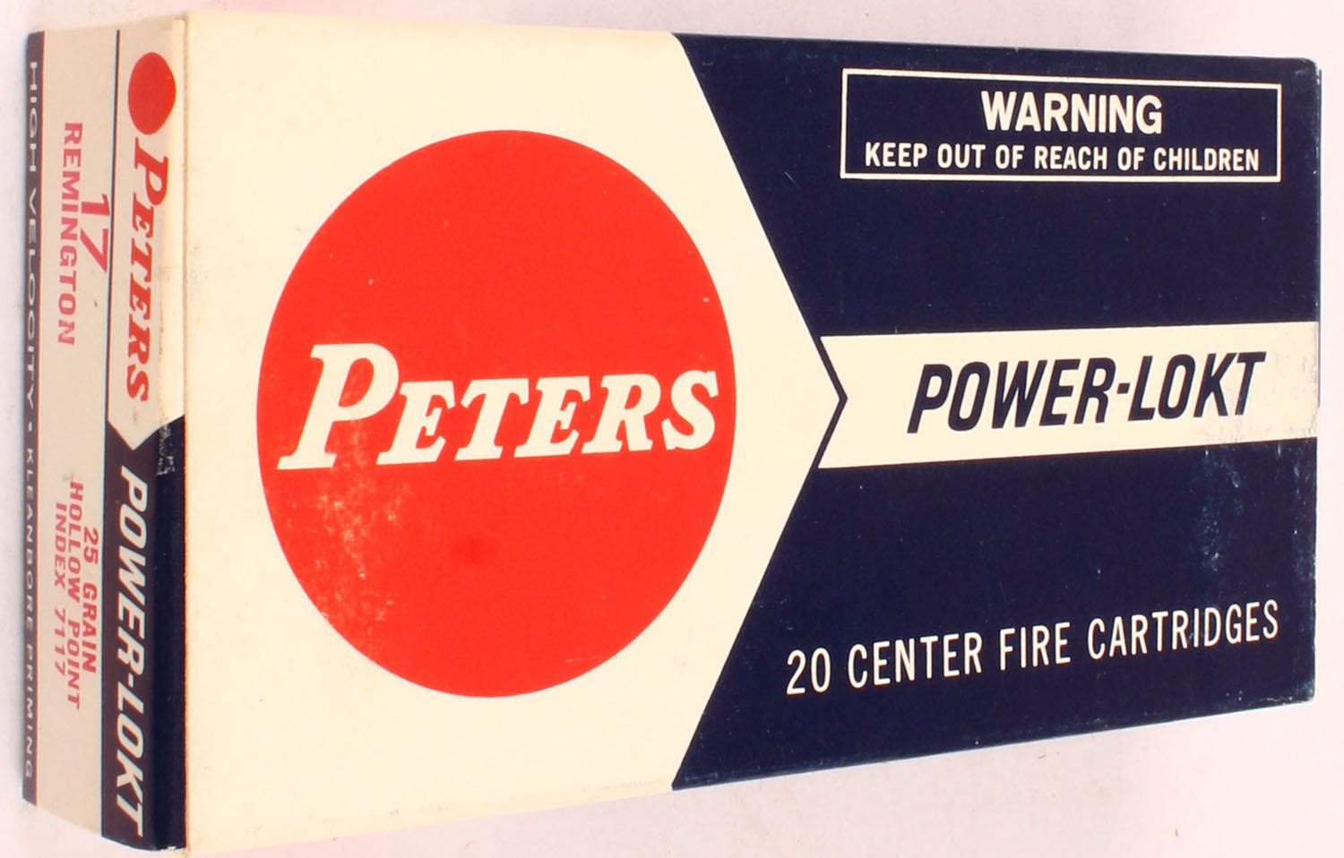 Peters, Power-Lokt, .17 Remington, 25 Grain Hollow Point, Full, 1pc. Blue white & red box, box is solid with excellent color, corners are sharp, edges are mostly crisp, end flaps are solid, ammo is excellent. Grade: Excellent ++ - Value: 20 to 60