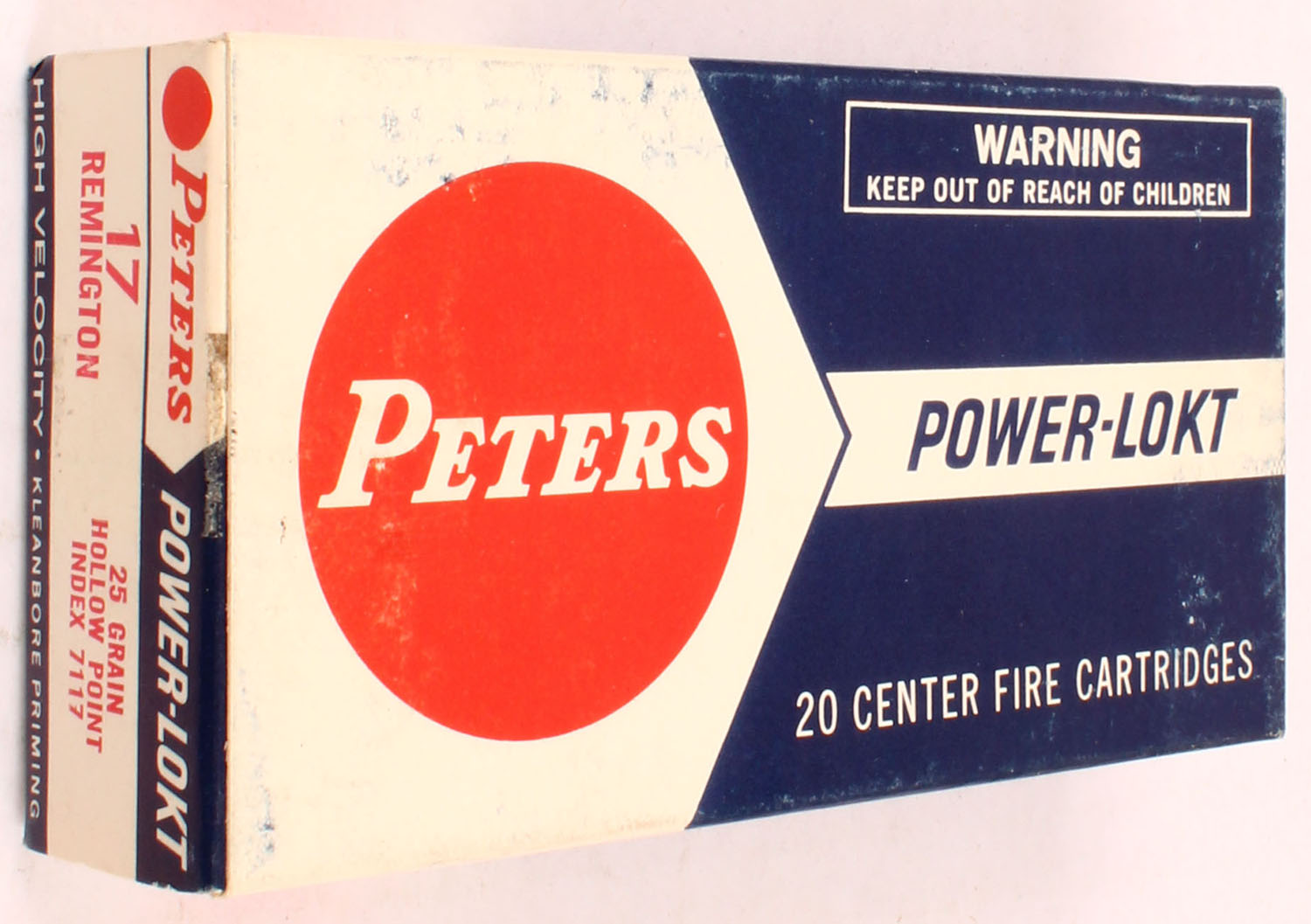 Peters, Power-Lokt, .17 Remington, 25 Grain Hollow Point, Full, 1pc. Blue white & red box, box is solid with excellent color, very minor shelf wear, corners are sharp, edges are mostly crisp, end flaps are solid, ammo is excellent. Grade: Excellent ++ - Value: 20 to 60