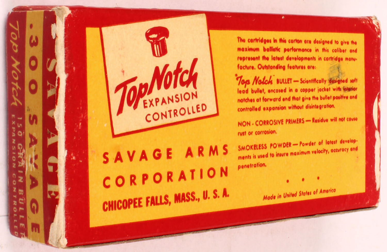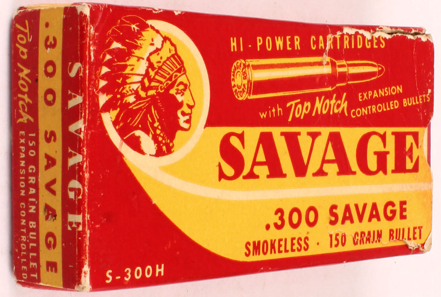 Savage, Hi-Power Cartridges, .300 Savage, 180 Grain Expansion Controlled Bullets, Full, 1pc. Red & yellow box, box is solid with excellent color, very minor age soiling & shelf wear, 2 tears on top right end, some corner wear, very minor edge wear, top & bottom have been written on, end flaps are solid, ammo is excellent. Grade: Very Good ++ - Value: 30 to 90