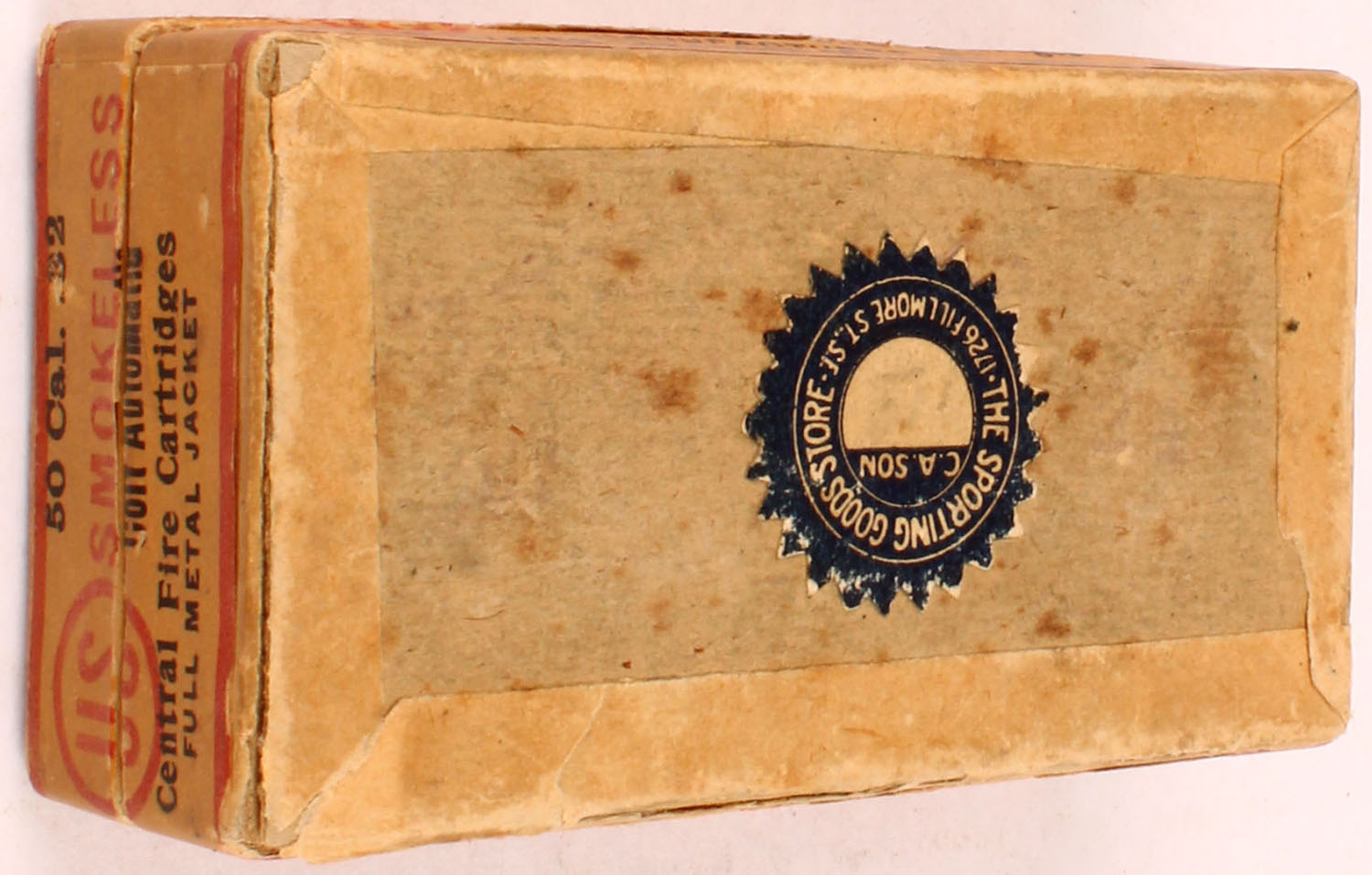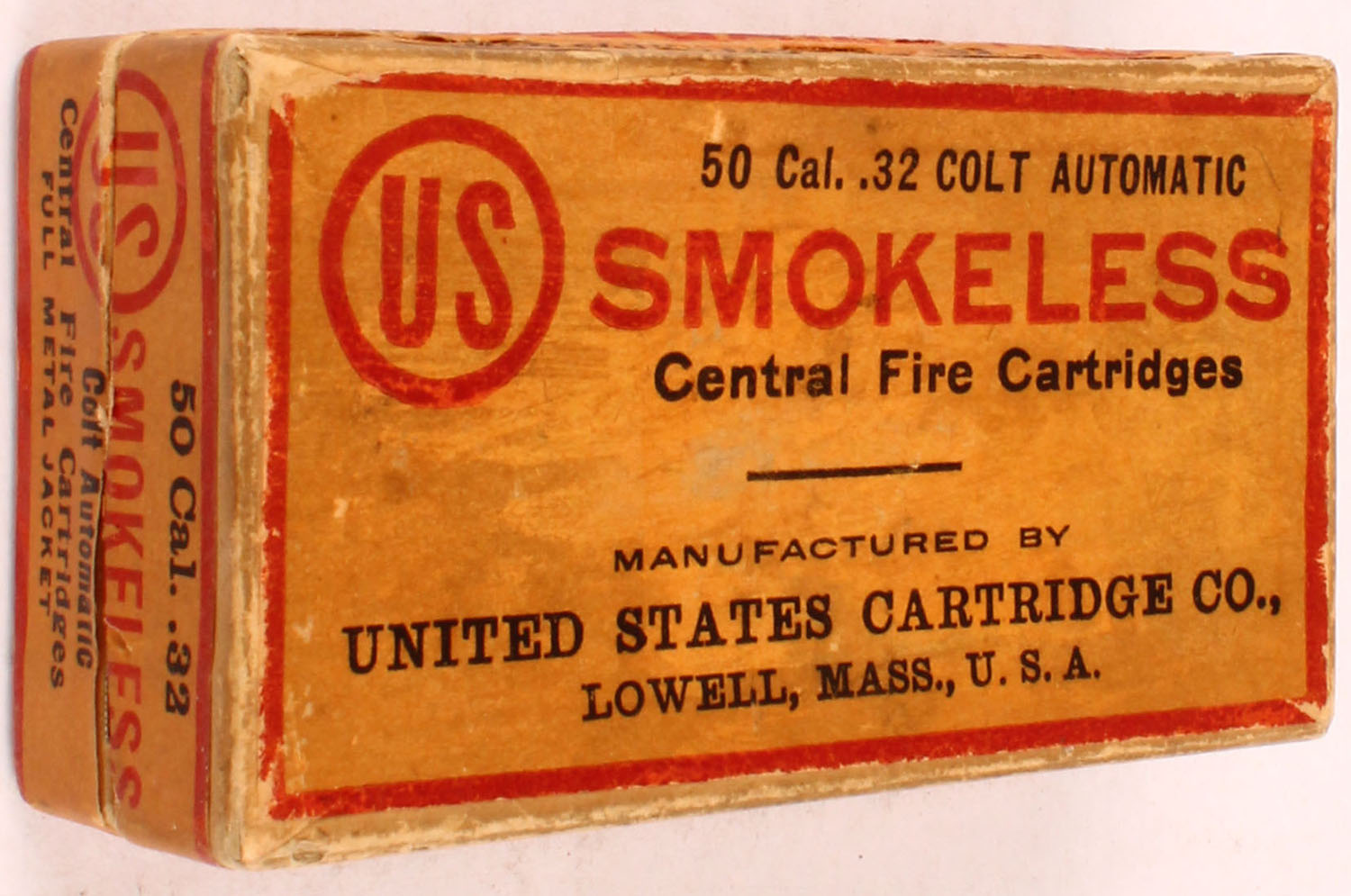 U.S., Smokeless, .32 Colt Automatic, Full Metal Jacket, Full, 2pc. Buff box with orange top & side sealing labels, box is solid with very good color, some age soiling, minor edge & corner wear, labels are intact, ammo is excellent. Grade: Excellent - Value: 30 to 90