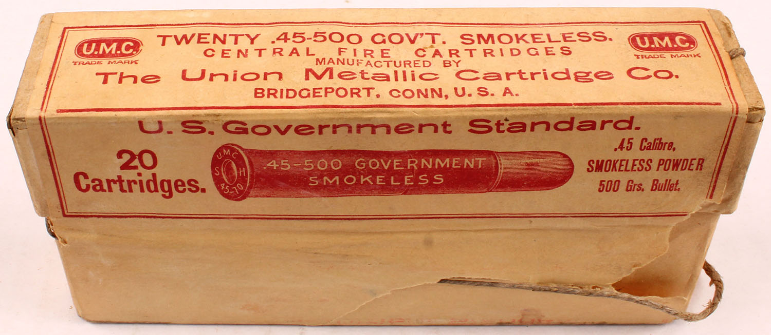 U.M.C., Central Fire Cartridges, .45-500 Gov't, 500 Grain Bullet, Smokeless, FULL & SEALED, 2pc. Buff box with buff & red wraparound label, box is solid with excellent to minty color, corners are sharp, edges are crisp, label is 99% intact, tear to label in front. Grade: Excellent ++ - Value: 30 to 90