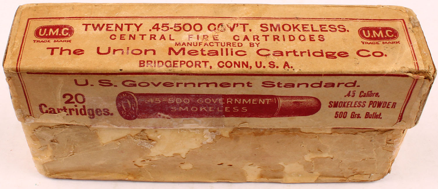 U.M.C., Central Fire Cartridges, .45-500 Gov't, 500 Grain Bullet, Smokeless, FULL & SEALED, 2pc. Buff box with buff & red wraparound label, box is solid with excellent color, some corner wear, very minor edge wear, label is 95% intact, ammo is excellent. Grade: Excellent + - Value: 20 to 60