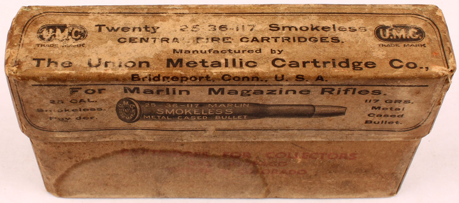 U.M.C., Central Fire Cartridges, .25-36 Marlin, 117 Grain Metal Cased Bullet, Smokeless, Full, 2pc. Buff box with buff label, box is solid with very good color, some age soiling & shelf wear, water stain on front, front has been stamped by a cartridge collectors organization, minor corner wear, edges are mostly crisp, label is intact, ammo is excellent. Grade: Very Good ++ - Value: 40 to 120
