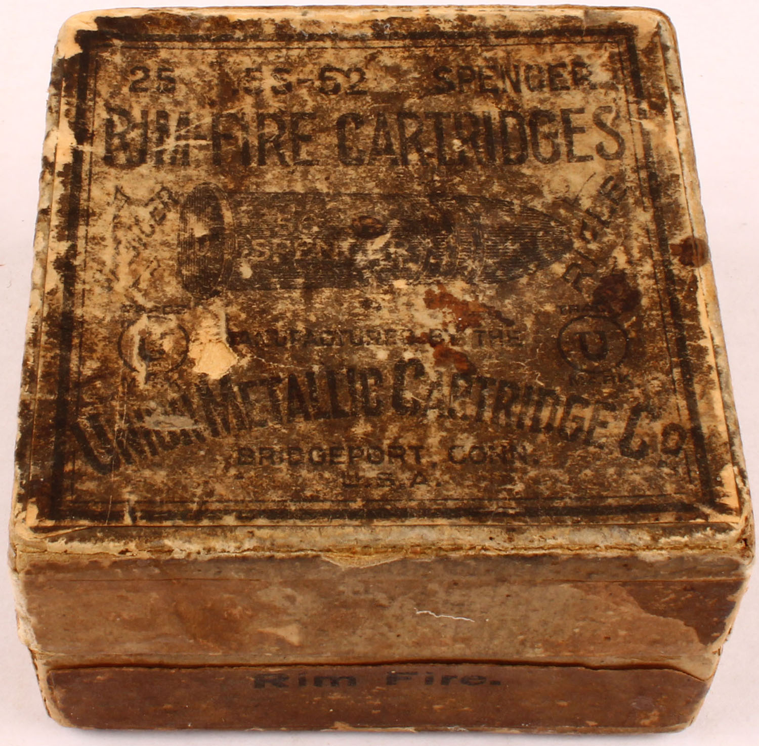 U.M.C., Rim-Fire Cartridges, .56-52 Spencer, Partial 7rds., 2pc. Buff box with buff top & side sealing labels, box is solid with fair color, age soiling, shelf wear, edge & corner wear, side sealing label is 60% intact, ammo is excellent. Grade: Good ++ - Value: 30 to 120