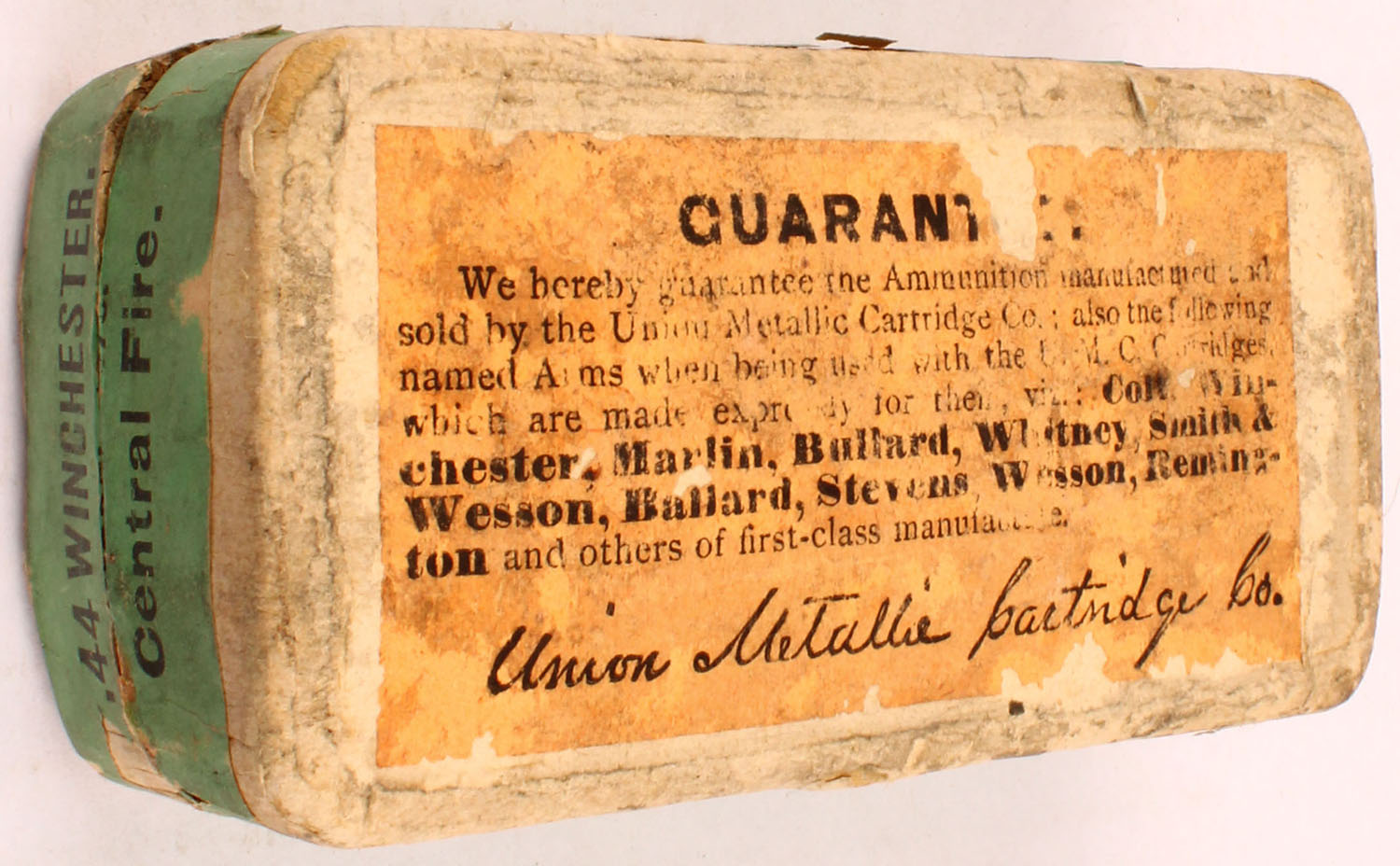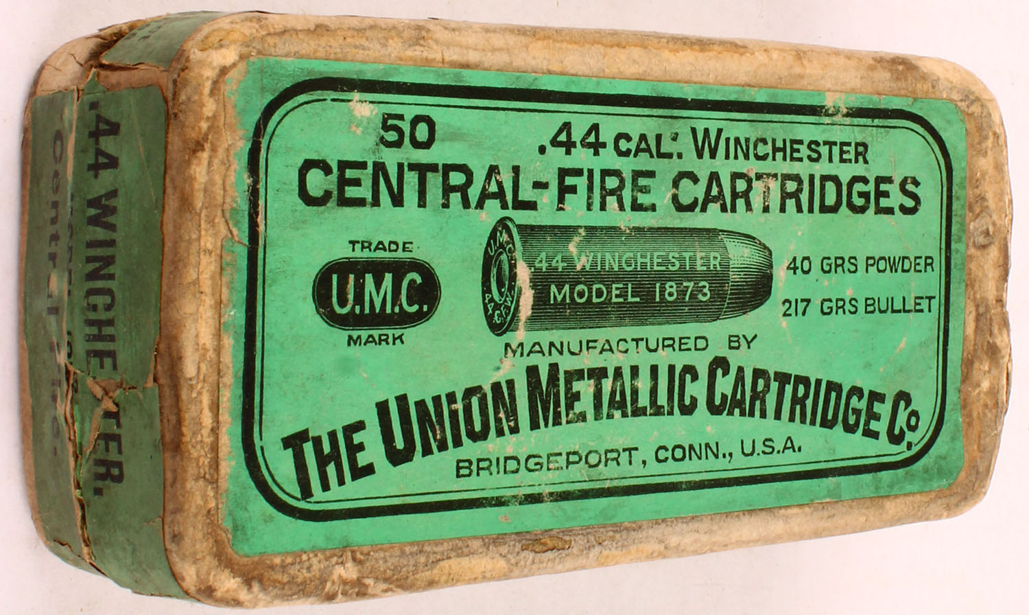 U.M.C., Central-Fire Cartridges, .44 Winchester, 40 Grains Powder, 217 Grain Bullet, Full, 2pc. Buff box with green top & side sealing labels, box is solid with very good color, age soiling around labels, edge & corner wear, label is 99% intact, ammo is excellent. Grade: Very Good ++ - Value: 50 to 150