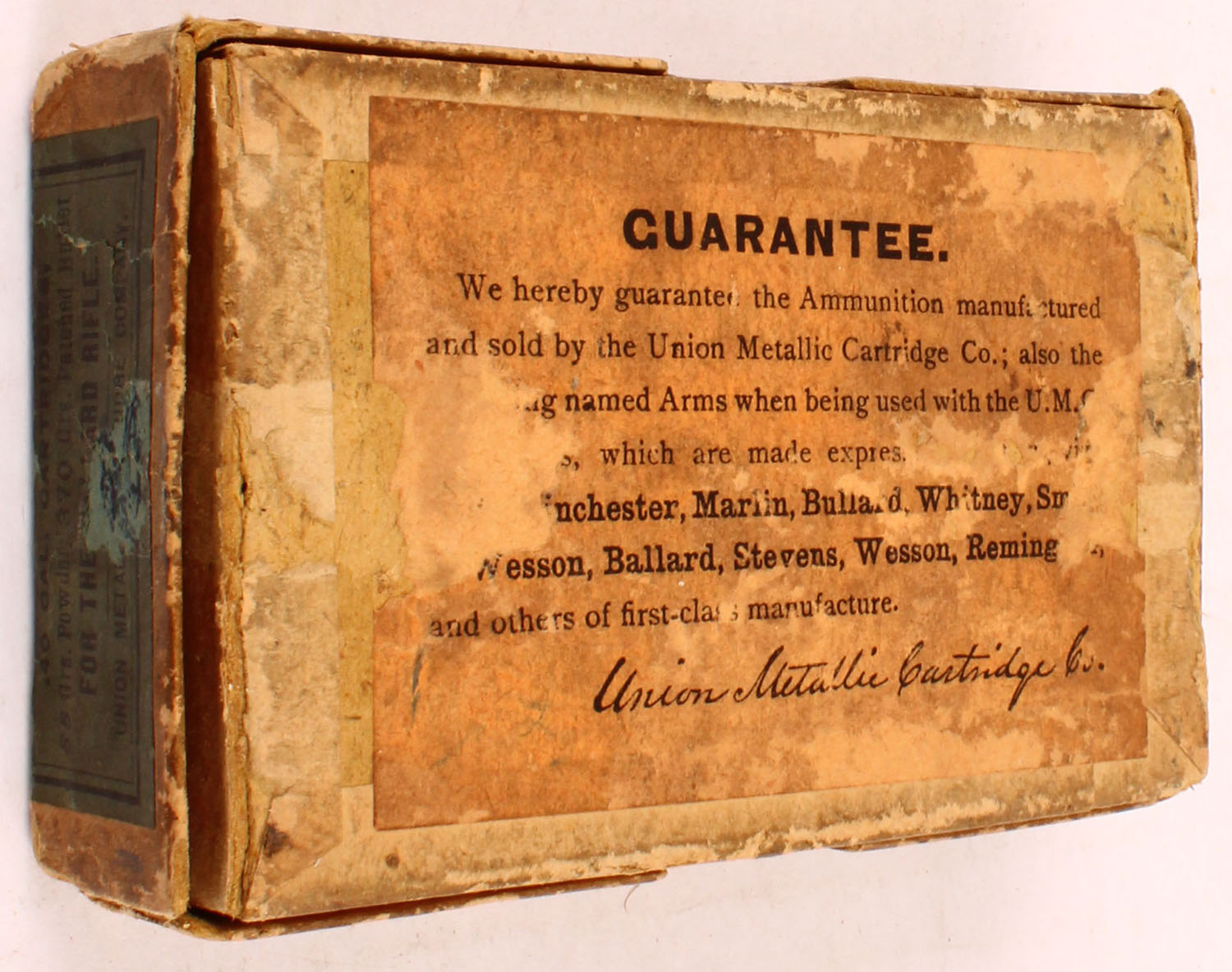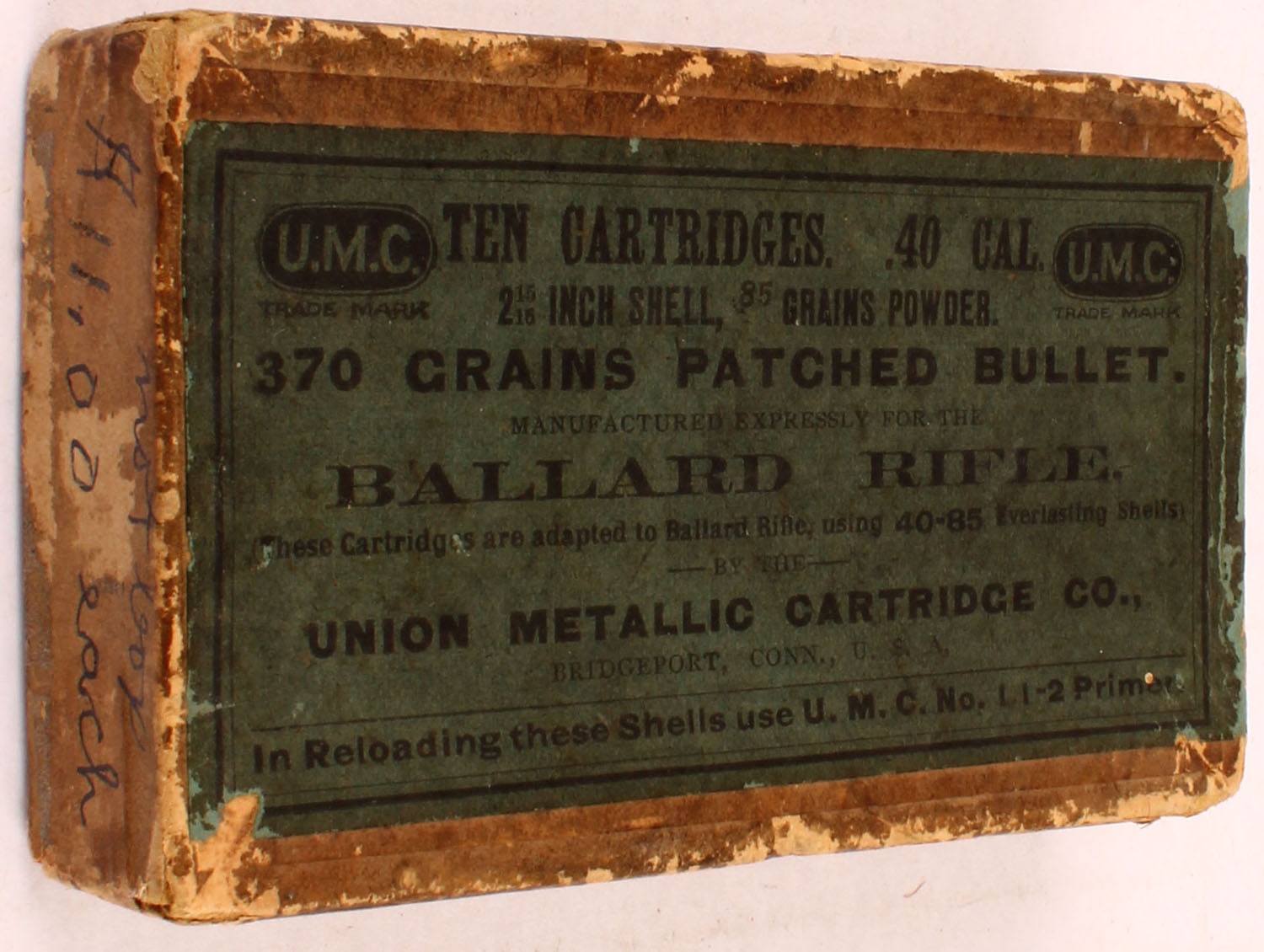 U.M.C., Ballard Rifle, .40 Cal., 2 15/16 Inch Shell, 85 Grains Powder, 370 Grains Patched Bullet, Partial 9rds., 2pc. Buff box with blue wraparound label, left end of box bottom is missing, box has good color, age soiling, edge & corner wear, vertical seam split to front right corner of lid, left end has been written on, label is 90% intact, ammo is excellent. Grade: Good ++ - Value: 80 to 240