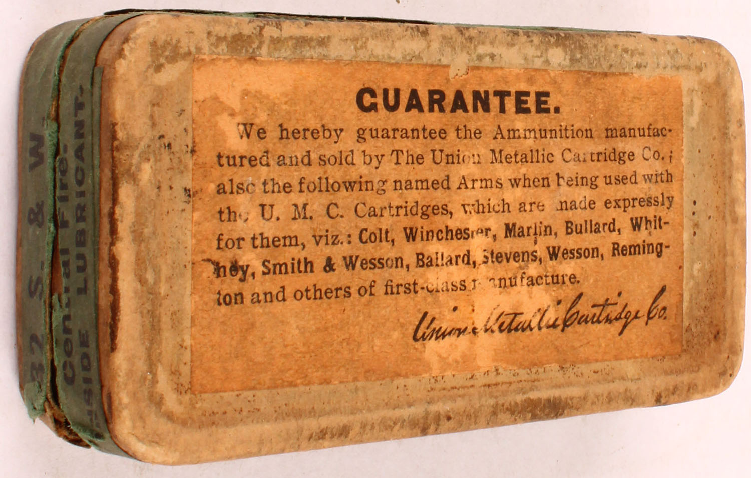 U.M.C., Central-Fire Cartridges, .32 Smith & Wesson, Full of mixed ammo, 2pc. Buff box with blue top & side sealing labels, box is solid with good color, age soiling, some edge & corner wear, labels are 95% intact, ammo is excellent. Grade: Very Good - Value: 10 to 50
