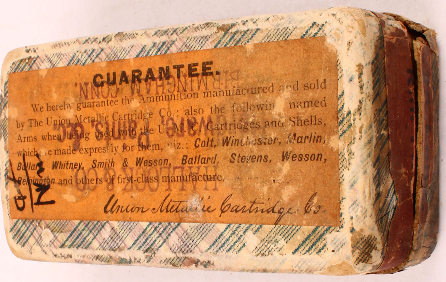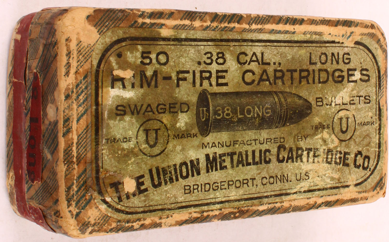 U.M.C., Rim-Fire Cartridges, .38 Long, Swaged Bullets, Full, 2pc. Blue fabric box with blue top & red side sealing labels, box is solid with good color, age soiling, some shelf wear, some edge & corner wear, side sealing label is 90% intact, ammo is very good. Grade: Very Good + - Value: 20 to 60