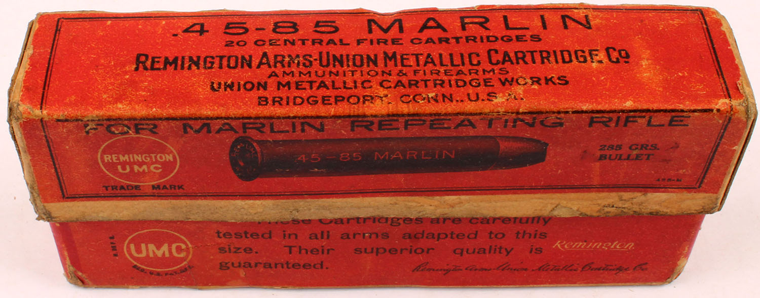 REM-UMC, .45-85 Marlin, 285 Grain Bullet, Full (U.M.C. S H H/S), 2pc. Buff box with red labels, box is solid with excellent color, some shelf & corner wear, some edge wear, labels are intact, tape on bottom, ammo is excellent. Grade: Excellent - Value: 400 to 1200