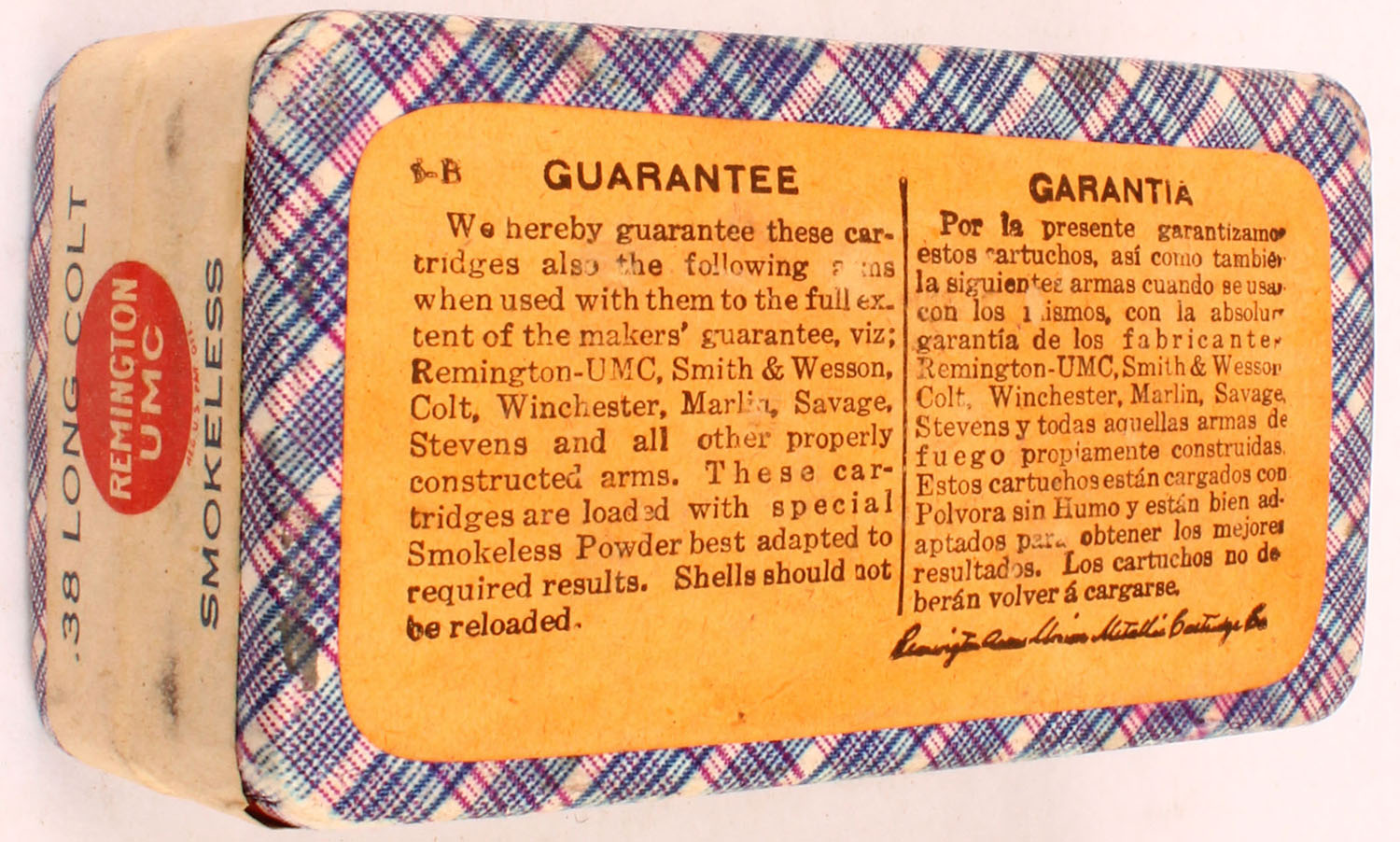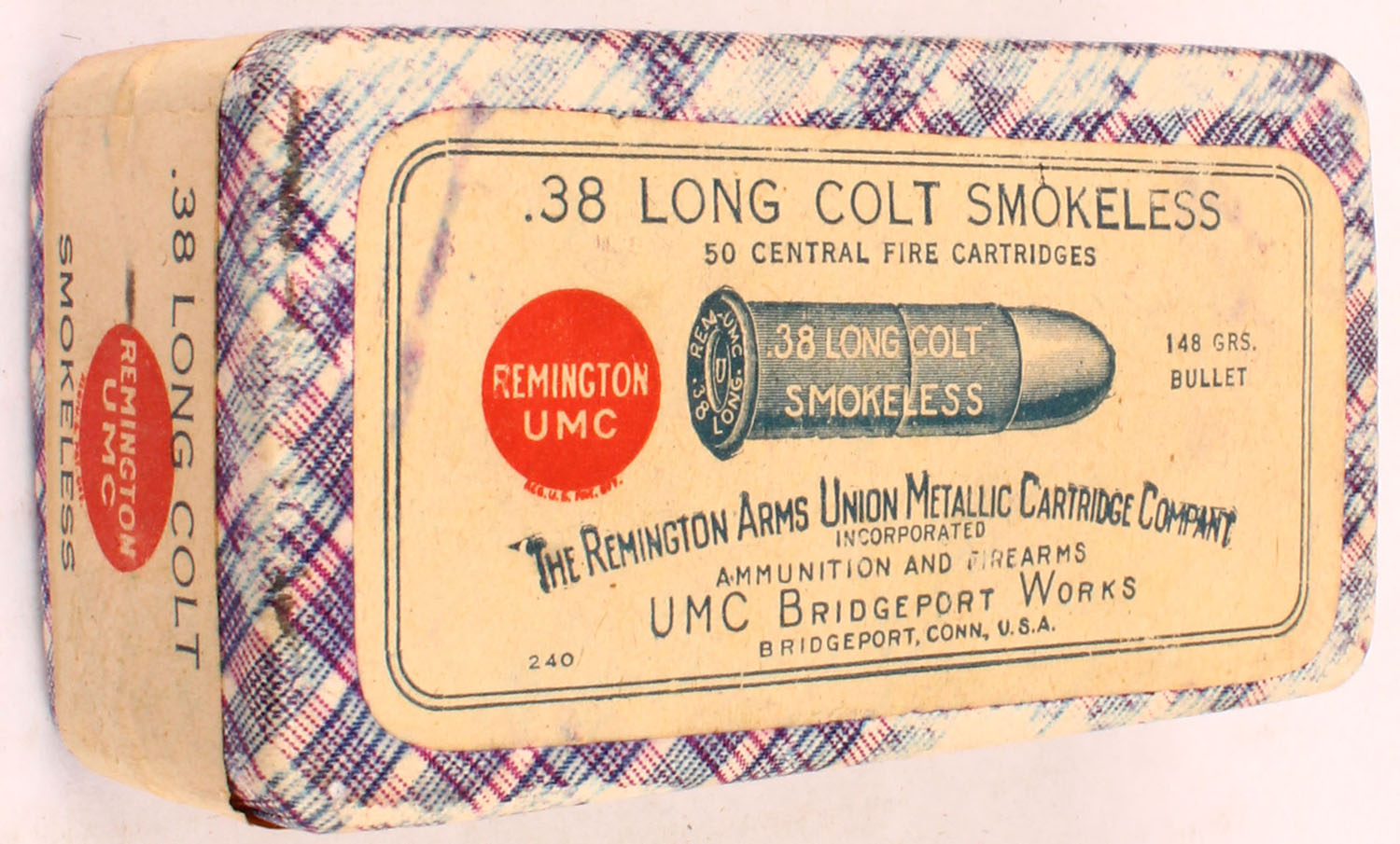 REM-UMC, .38 Long Colt, 148 Grain Bullet, Smokeless, FULL & SEALED, 2pc. Purple fabric box with buff top & side sealing labels, box is solid with excellent color, some shelf wear, very minor edge & corner wear, labels are intact. Grade: Excellent ++ - Value: 40 to 250