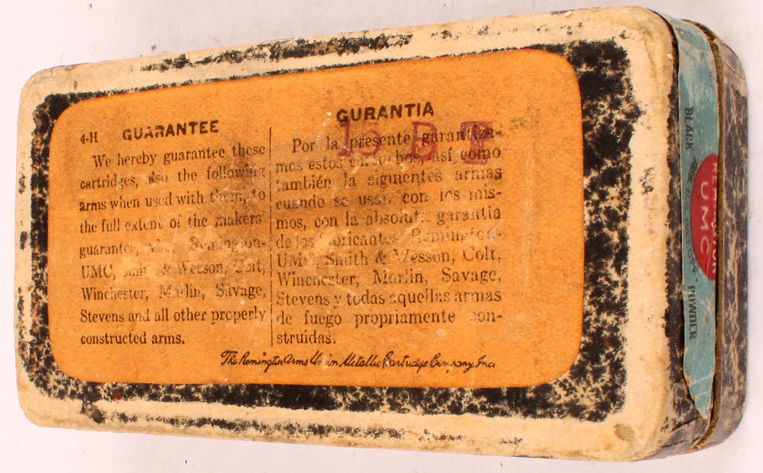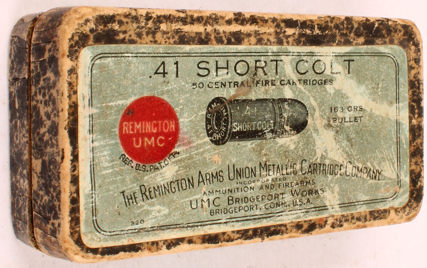 REM-UMC, .41 Short Colt, 163 Grain Bullet, Black Powder, Full of Mixed H/S, 2pc. Black mottled box with blue top & side sealing labels, box is solid with very good color, age soiling & shelf wear, some edge & corner wear, side sealing label is 40% intact, ammo is good to very good. Grade: Very Good - Value: 30 to 90