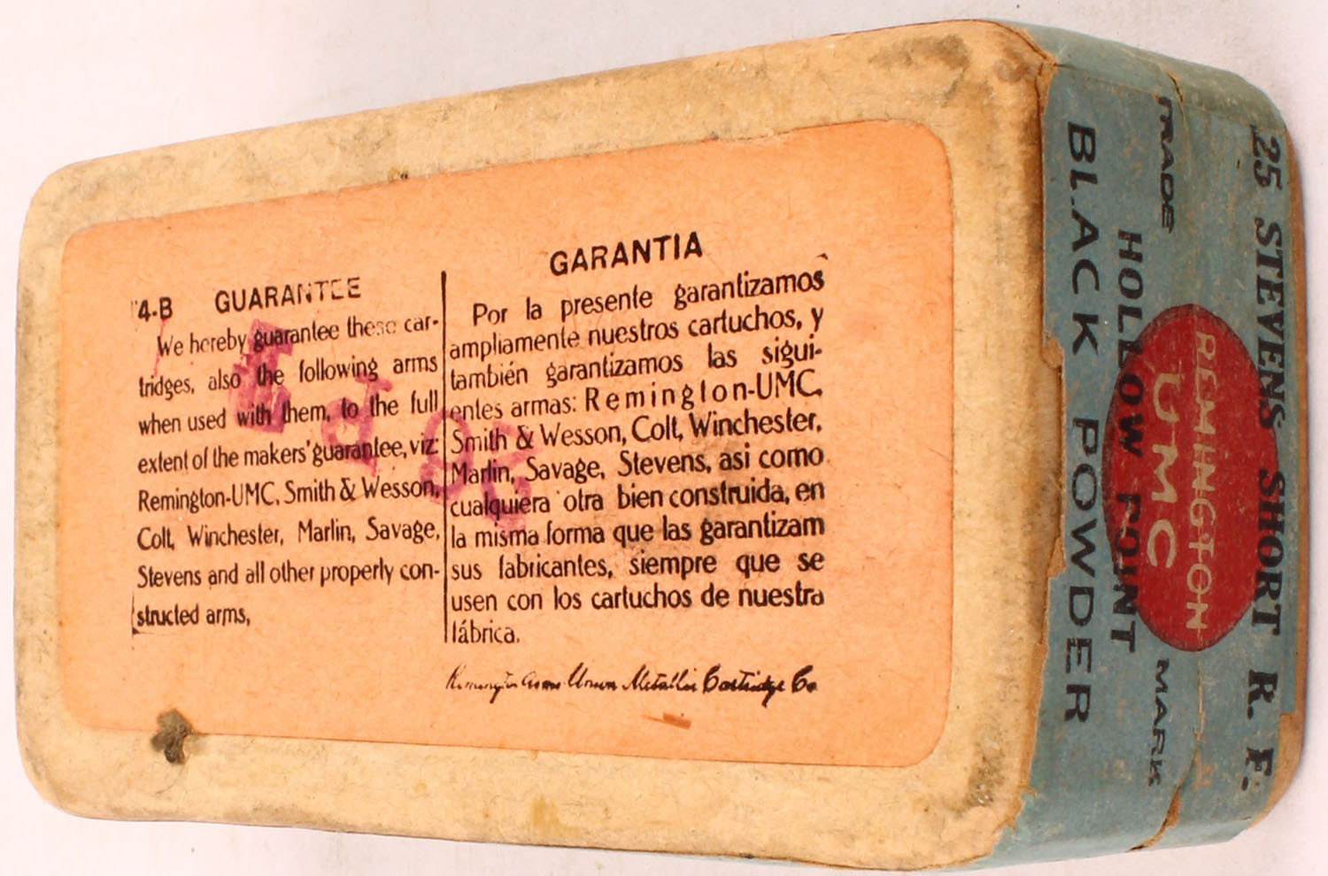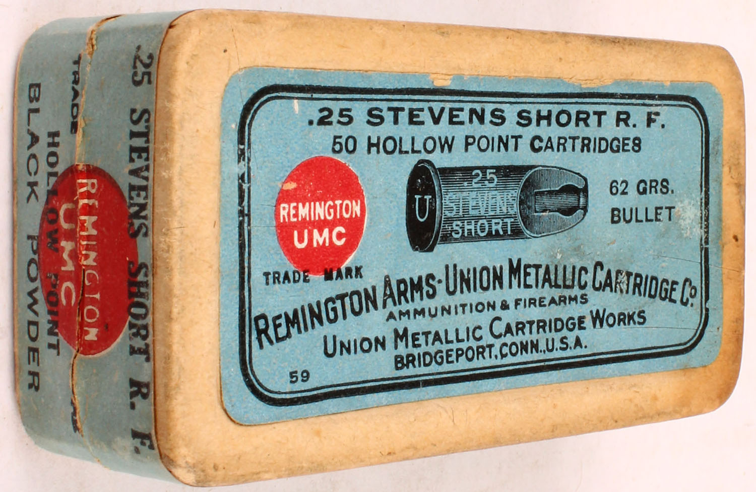 REM-UMC, .25 Stevens Short Rim Fire, 62 Grain Hollow Point, Full, 2pc. Buff box with blue top & side sealing labels, box is solid with excellent color, very minor age soiling & color fading, corners are mostly sharp, edges are crisp, labels are intact, ammo is excellent. Grade: Excellent ++ - Value: 100 to 500