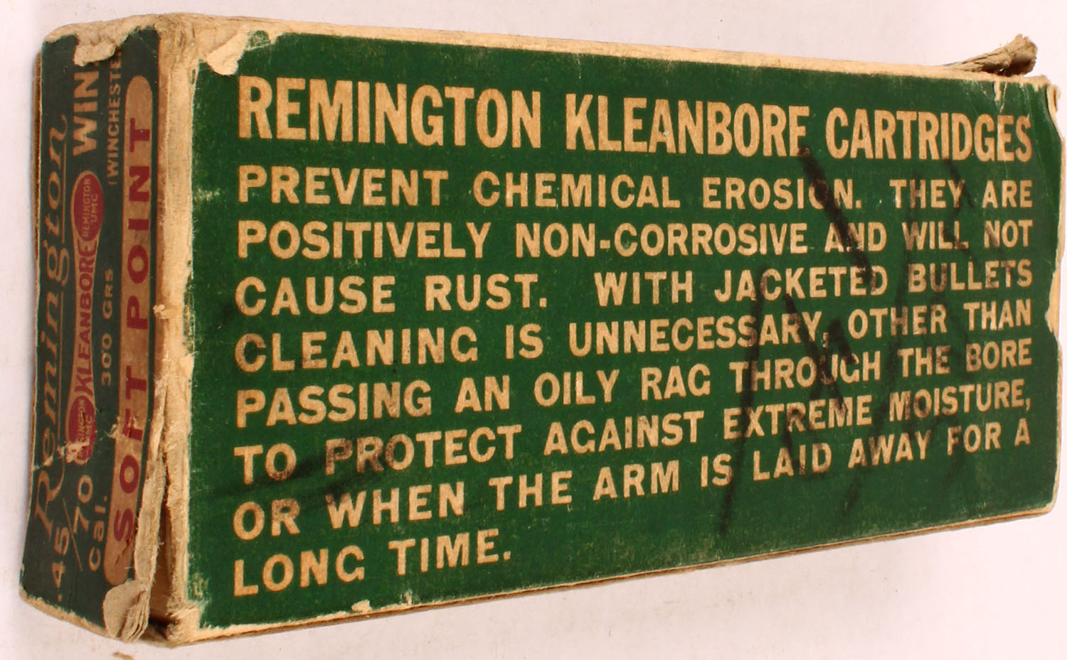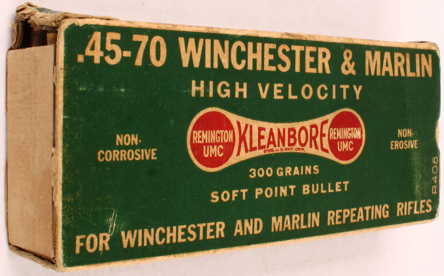 Remington, Kleanbore, .45-70 Winchester, 300 Grain Soft Point Bullet, High Velocity, Full, 1pc. Green white & red dogbone box, box is solid with very good to excellent color, some age soiling & corner wear, minor edge wear, right end flap is solid, ammo is excellent. Grade: Very Good + - Value: 20 to 60