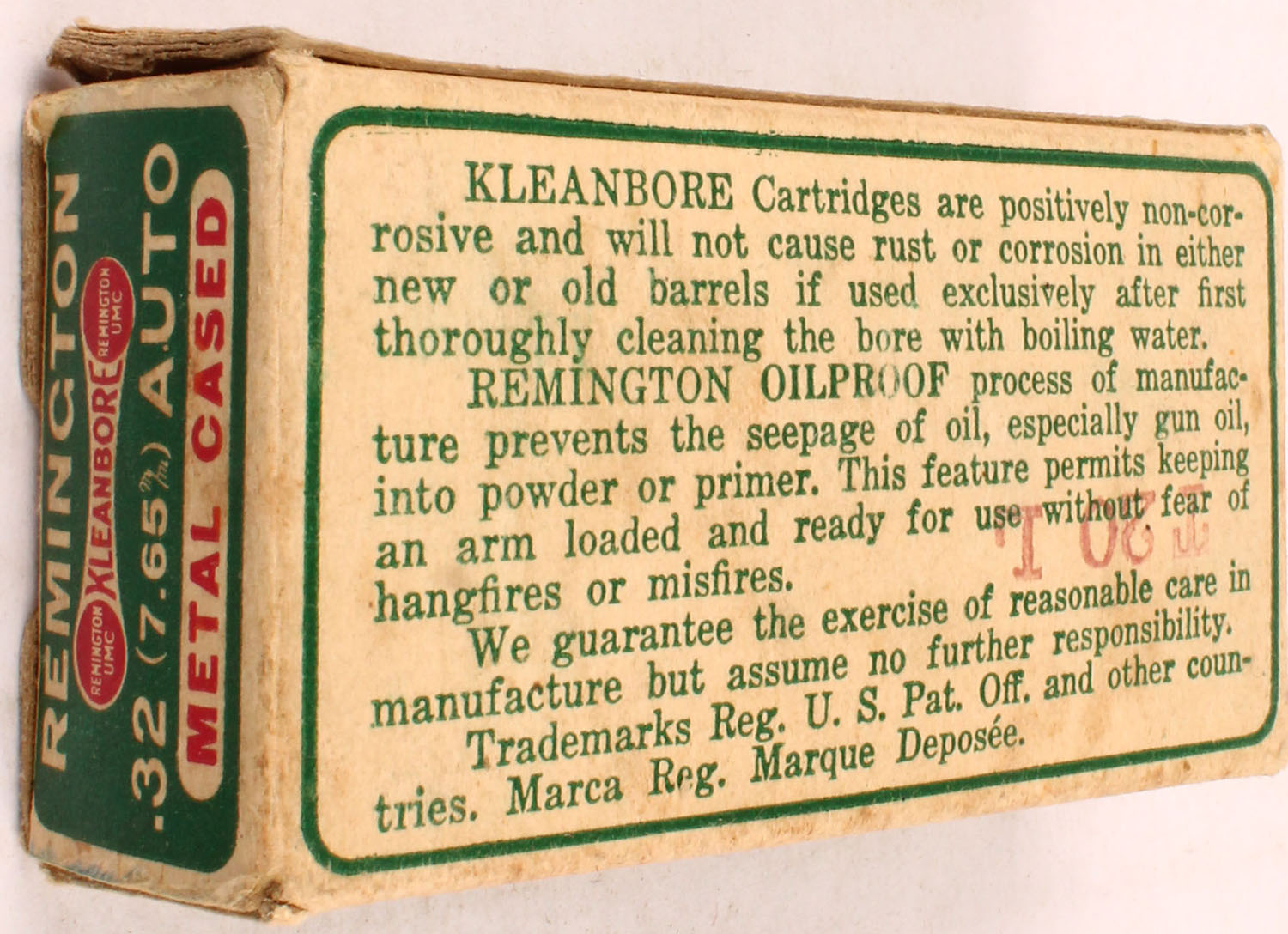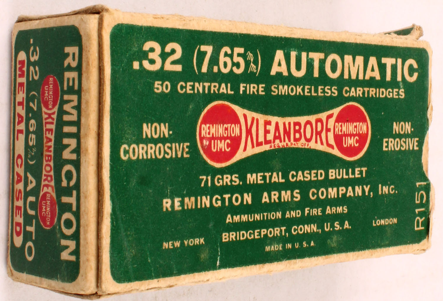 Remington, Kleanbore, .32 Automatic (7.65mm), 71 Grain Metal Cased Bullet, Partial 49rds., 1pc. Green white & red box, box is solid with excellent color, very minor age soiling, partial seam split to top front edge, corner wear, minor edge wear, end flaps are solid, ammo is excellent. Grade: Very Good ++ - Value: 10 to 50
