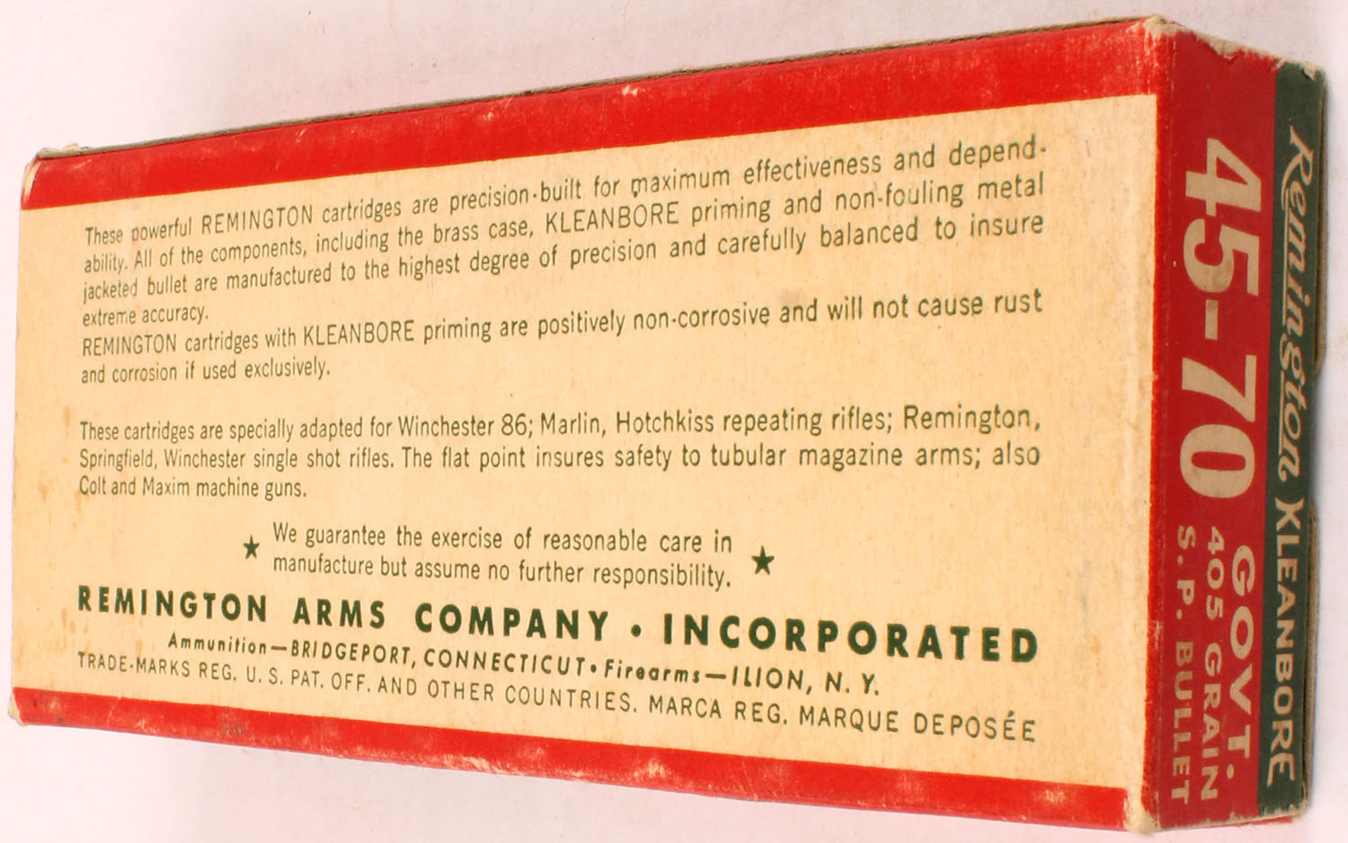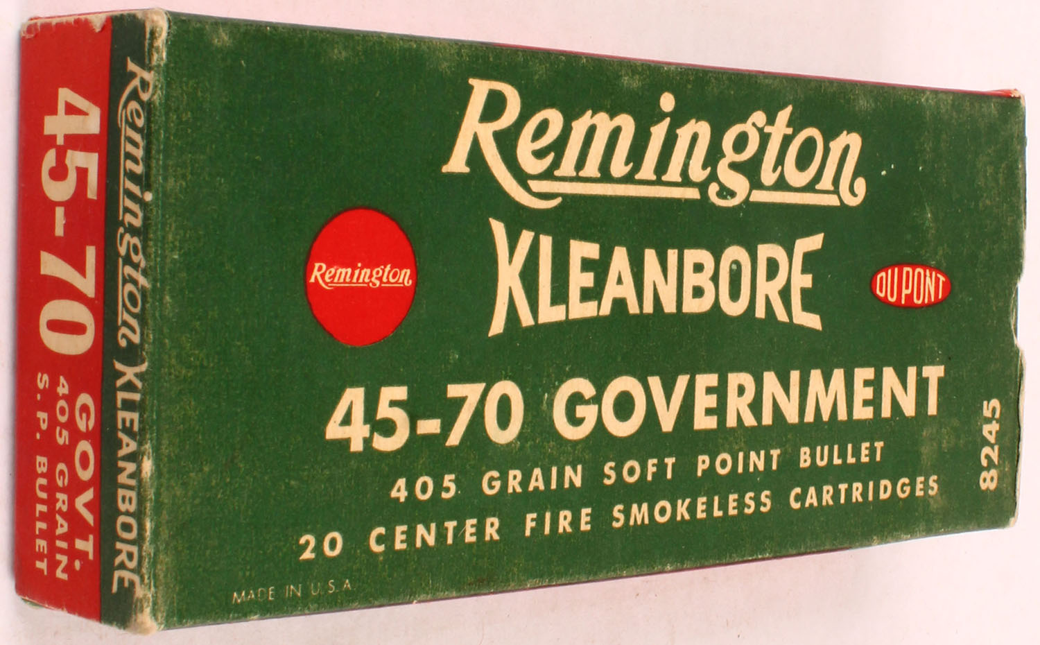 Remington, Kleanbore, .45-70 Government, 405 Grain Soft Point Bullet, Full, 1pc. Green red & white box, box is solid with excellent color, very minor age soiling & shelf wear, minor corner wear, edges are mostly crisp, end flaps are solid, ammo is excellent. Grade: Excellent + - Value: 30 to 90
