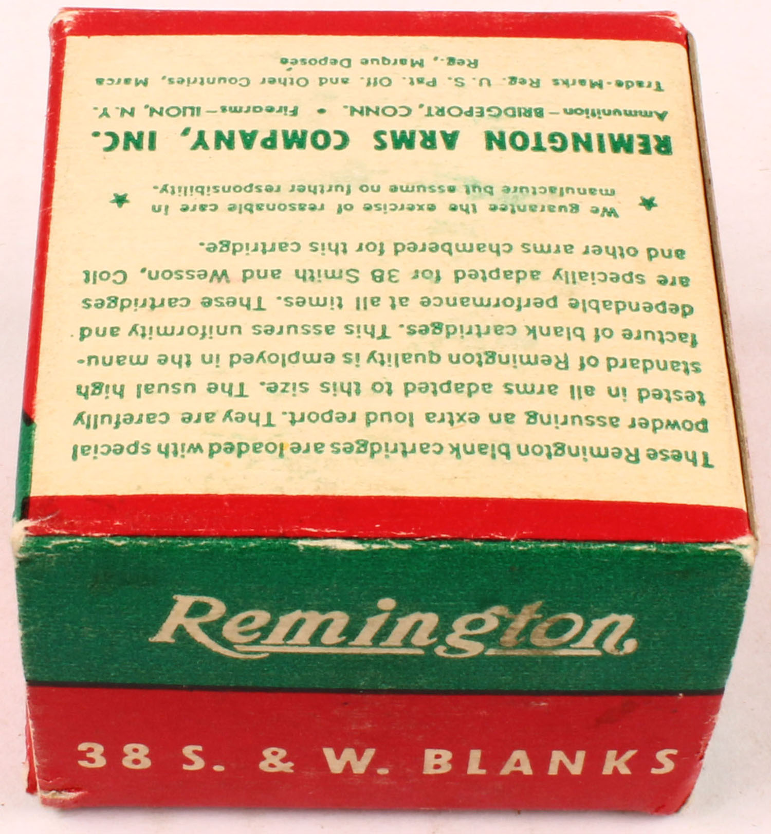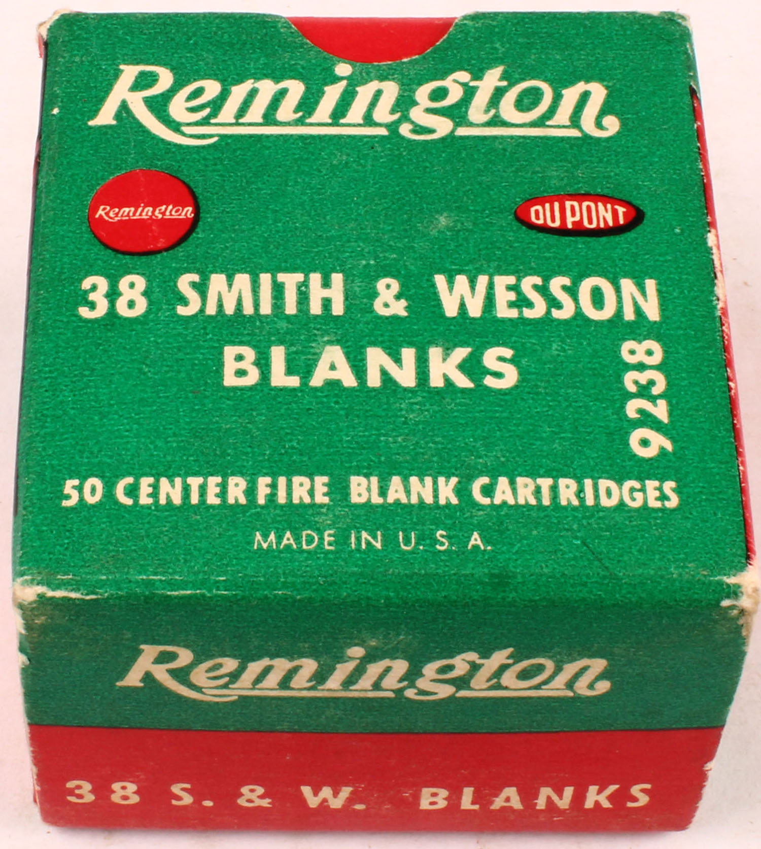 Remington, .38 Smith & Wesson Blanks, Extra Loud Report, Full, 1pc. Green red & white box, box is solid with excellent color, minor corner wear, edges are mostly crisp, end flaps are solid, ammo is excellent. Grade: Excellent + - Value: 10 to 50