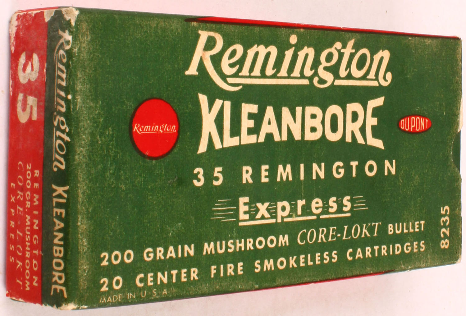 Remington, Kleanbore Express, .35 Remington, 200 Grain Mushroom Core-Lokt Bullet, Full, 1pc. Green red & white box, box is solid with excellent color, minor age soiling & shelf wear, minor corner wear, edges are mostly crisp, end flaps are solid, ammo is excellent. Grade: Excellent + - Value: 30 to 80