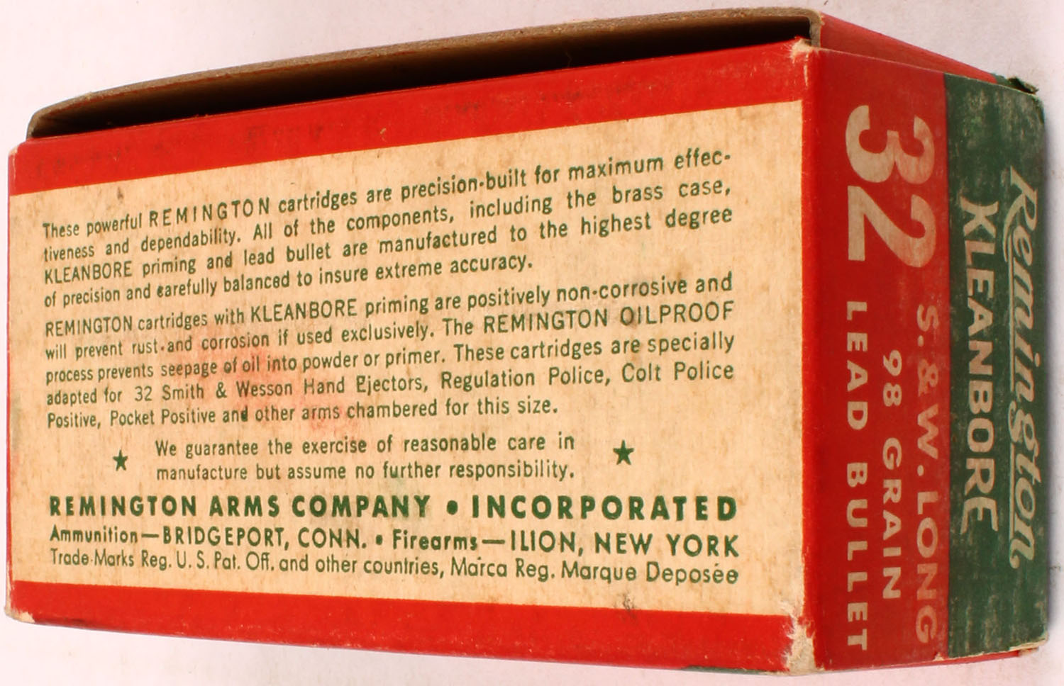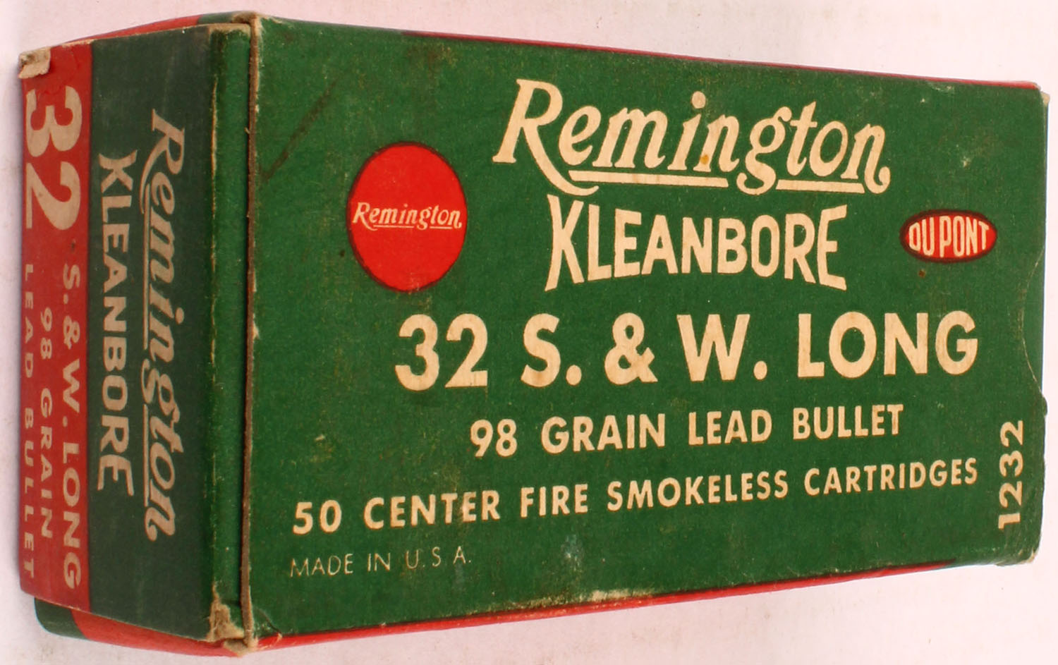 Remington, Kleanbore, .32 Smith & Wesson Long, 98 Gr. Lead bullet, 1pc, Full, Green, red, & white box, box is solid with factory glue seal has come undone, light rub marks on one end, & very light handling wear, ammo is very good. Grade: Excellent + - Value: 20 to 60