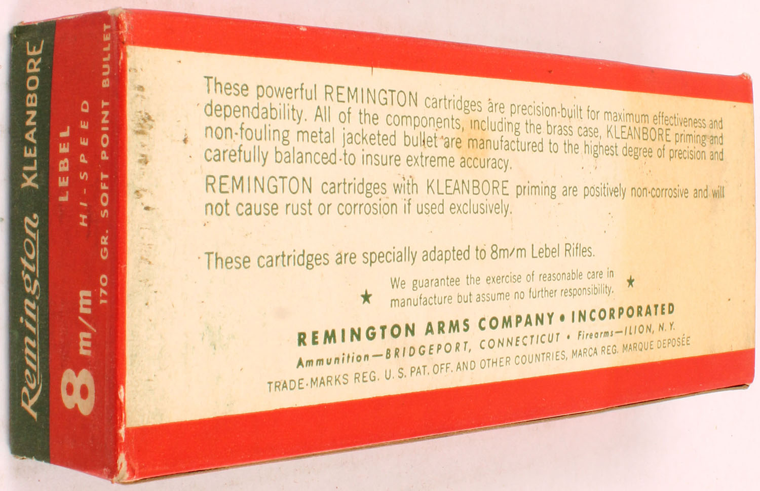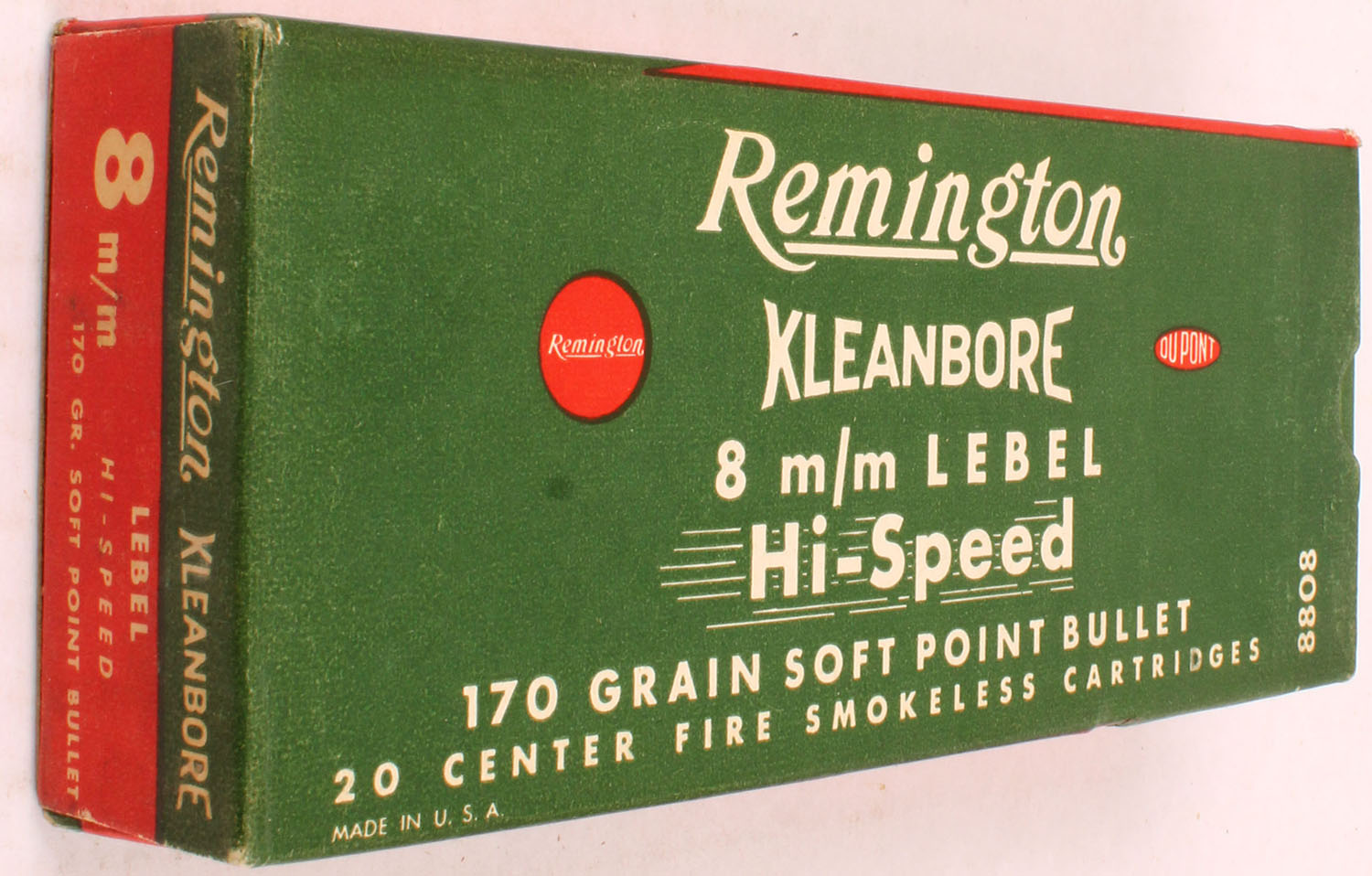 Remington, Kleanbore, 8mm Lebel, Hi-Speed, 170 Gr. Soft Point bullet, 1pc, Full, Green, red, & white box, box is solid with very light rub wear on bottom, ammo is excellent. Grade: Excellent ++ - Value: 20 to 40
