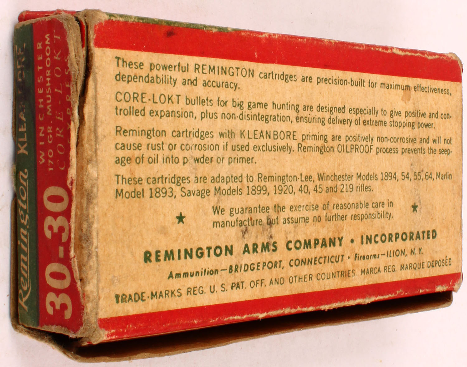 Remington, Kleanbore, .30-30 Winchester Express, 170 Gr. mushroom Core-Lokt bullet, 1pc, Full with one Incorrect H/S, Green/red box with white print, box has partial seam tear in right end flap, one inside flap on right end missing, factory glued seal has come undone, light pen marks on right end flap, age soiling, light rub marks, & light edge wear, ammo is Full. Grade: Very Good - Value: 20 to 60