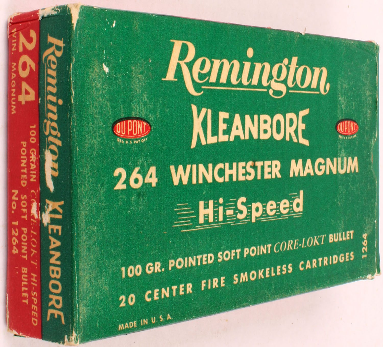 Remington, Kleanbore, .264 Winchester Magnum Hi-Speed, 100 Gr. Pointed Soft Point Core-Lokt bullet, 1pc, Full, Green/red box with white print, box is solid with two inside end flaps detached, rub marks, edge/corner wear, & light age soiling on bottom, ammo is excellent. Grade: Very Good ++ - Value: 30 to 60