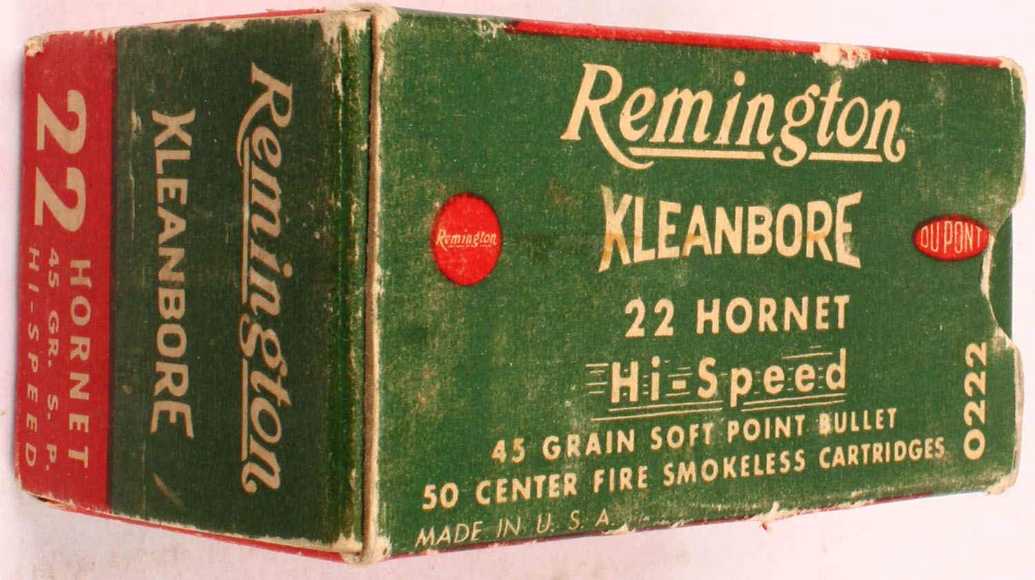 Remington, Kleanbore, .22 Hornet Hi-Speed, 45 Gr. Soft Point bullet, MILITARY MARKED BOX, ''LOT RA 5005'', stamp is faint but still present, 1pc, Full, Green/red box with white print, box is solid with rub marks, light edge/corner wear, & pen marks on side, ammo is excellent. Grade: Very Good ++ - Value: 50 to 100