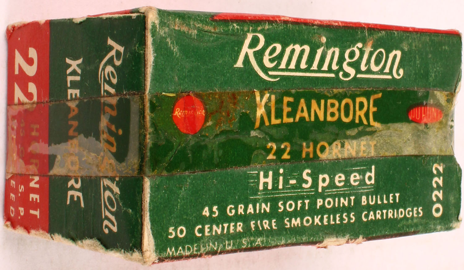 Remington, Kleanbore, .22 Hornet Hi-Speed, 45 Gr. Soft Point bullet, MILITARY MARKED BOX, ''LOT RA 5018'', 1pc, Full, Green/red box with white print, box is solid with tape across box, sticker marks on sides, light rub marks, & light edge wear, ammo is excellent. Grade: Excellent - Value: 50 to 100