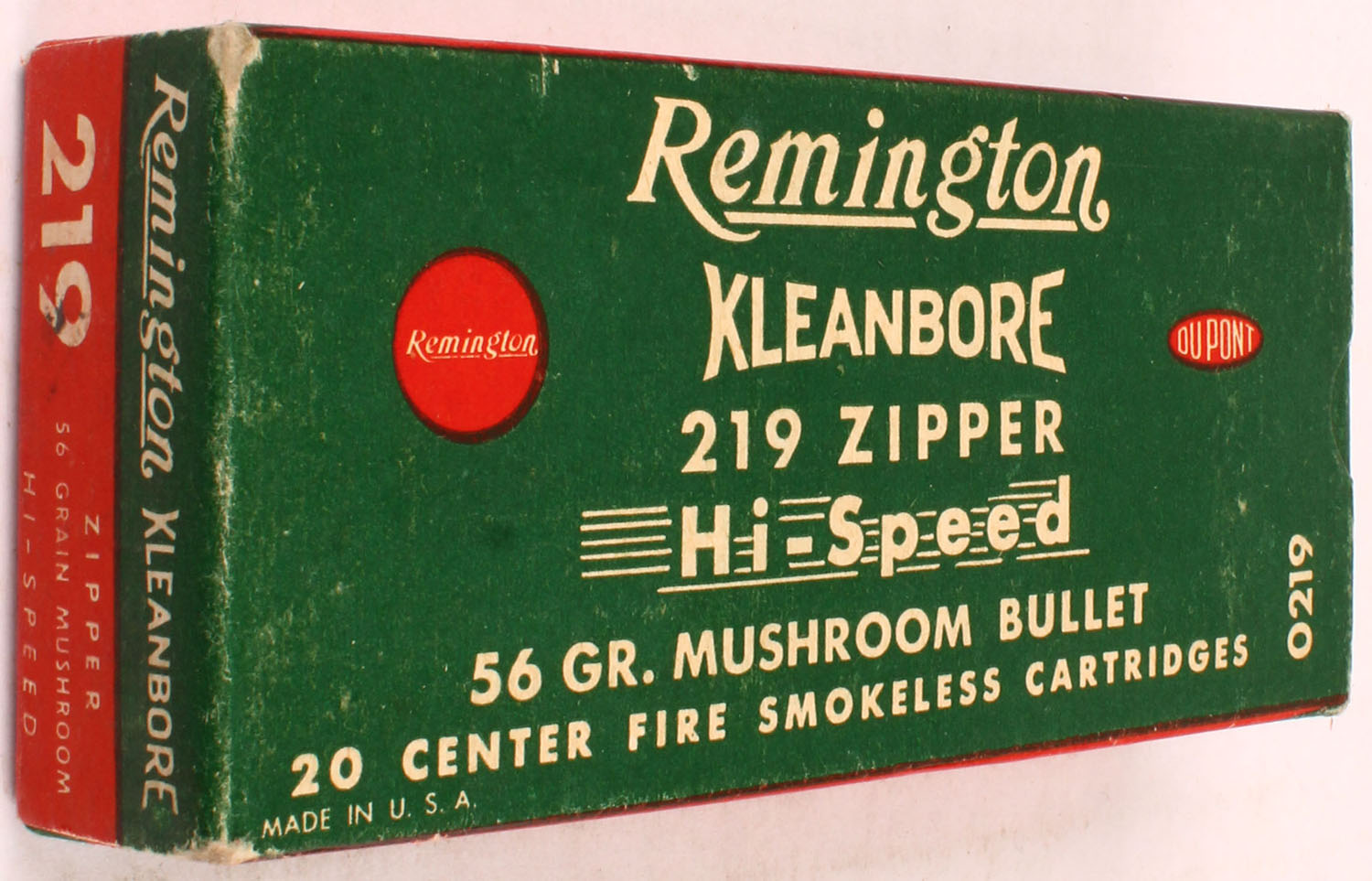 Remington, Kleanbore, .219 Zipper Hi-Speed, 56 Gr. mushroom bullet, 1pc, Full, Green/red box with white print, box is solid with rub marks, ammo is excellent. Grade: Excellent + - Value: 100 to 300