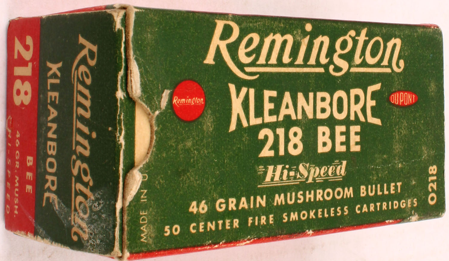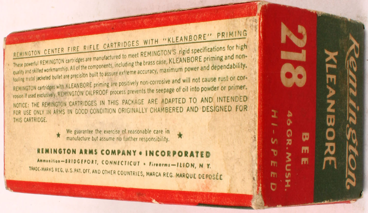 Remington, Kleanbore, .219 Bee Hi-Speed, 46 Gr. mushroom bullet, 1pc, Empty, has fired cases with wrong H/S inside, Green/red box with white print, box is solid with rub marks, pen marks on one side, light age soiling/stains on bottom, & light edge wear. Grade: Very Good ++ - Value: 20 to 80