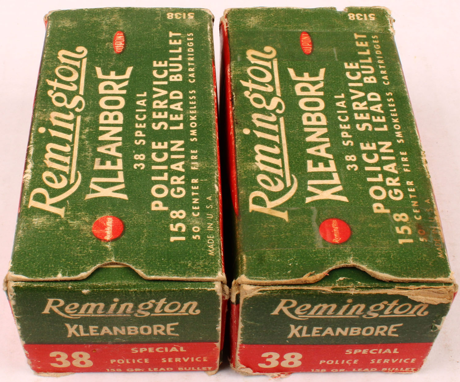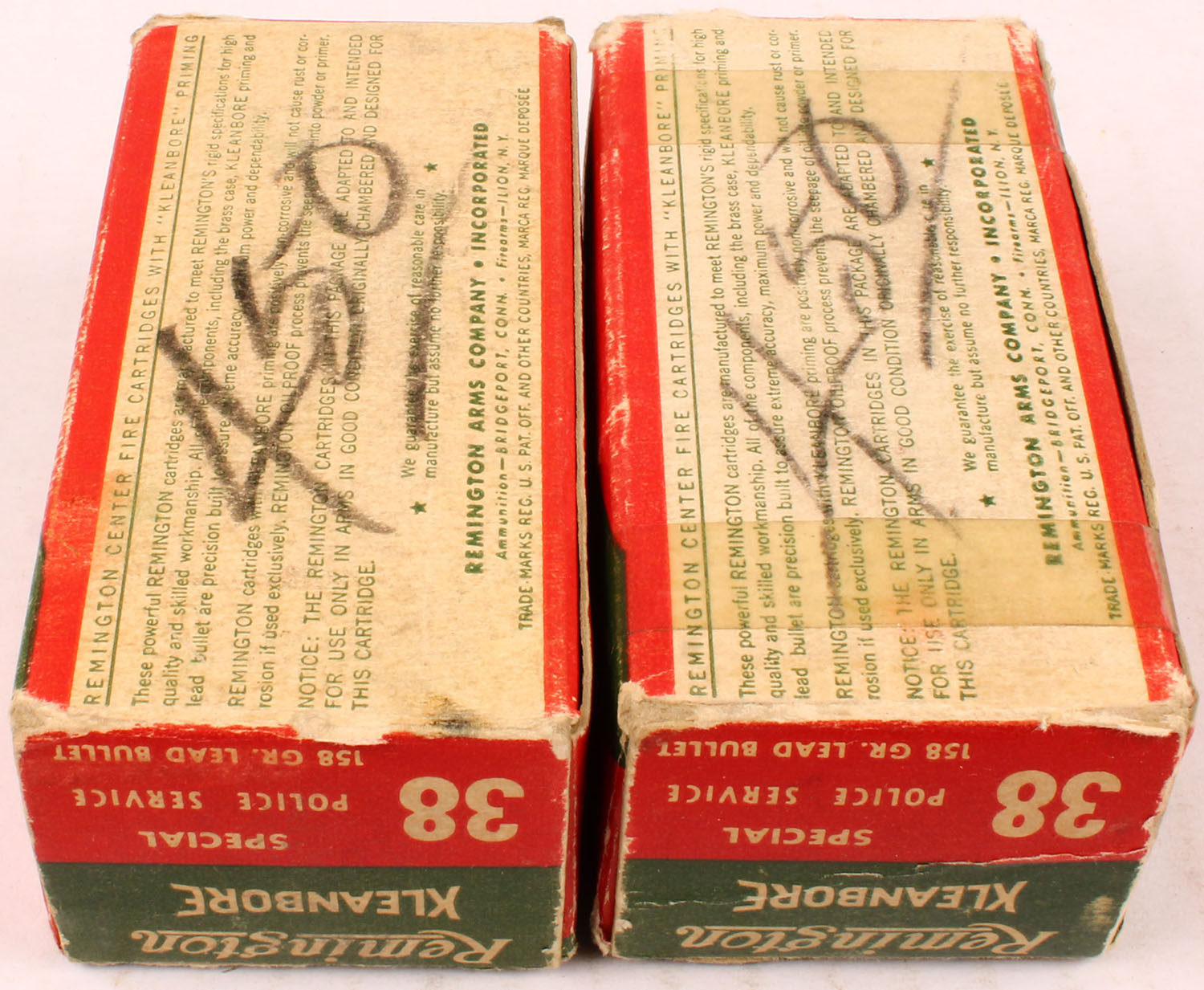 Lot of two, Remington, Kleanbore, .38 Special Police Service, 158 Gr. Lead bullet, 1pc, Both full with Mixed H/S, about 65% correct ammo, Green/red box with white print, boxes are solid with tape, pen marks on bottom, partial tears on seams, rub marks & edge wear, ammo is very good. Grade: Very Good + - Value: 70 to 140