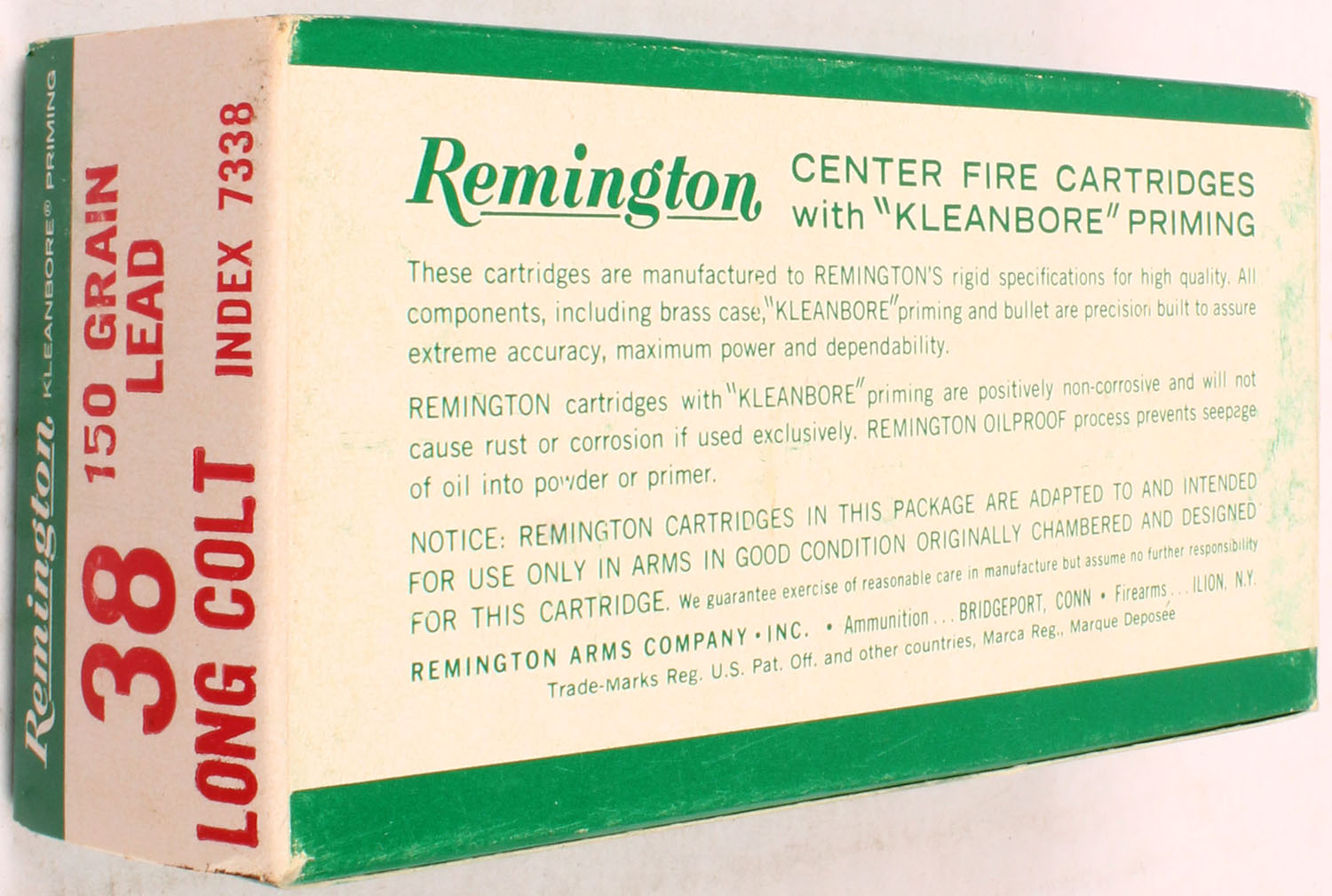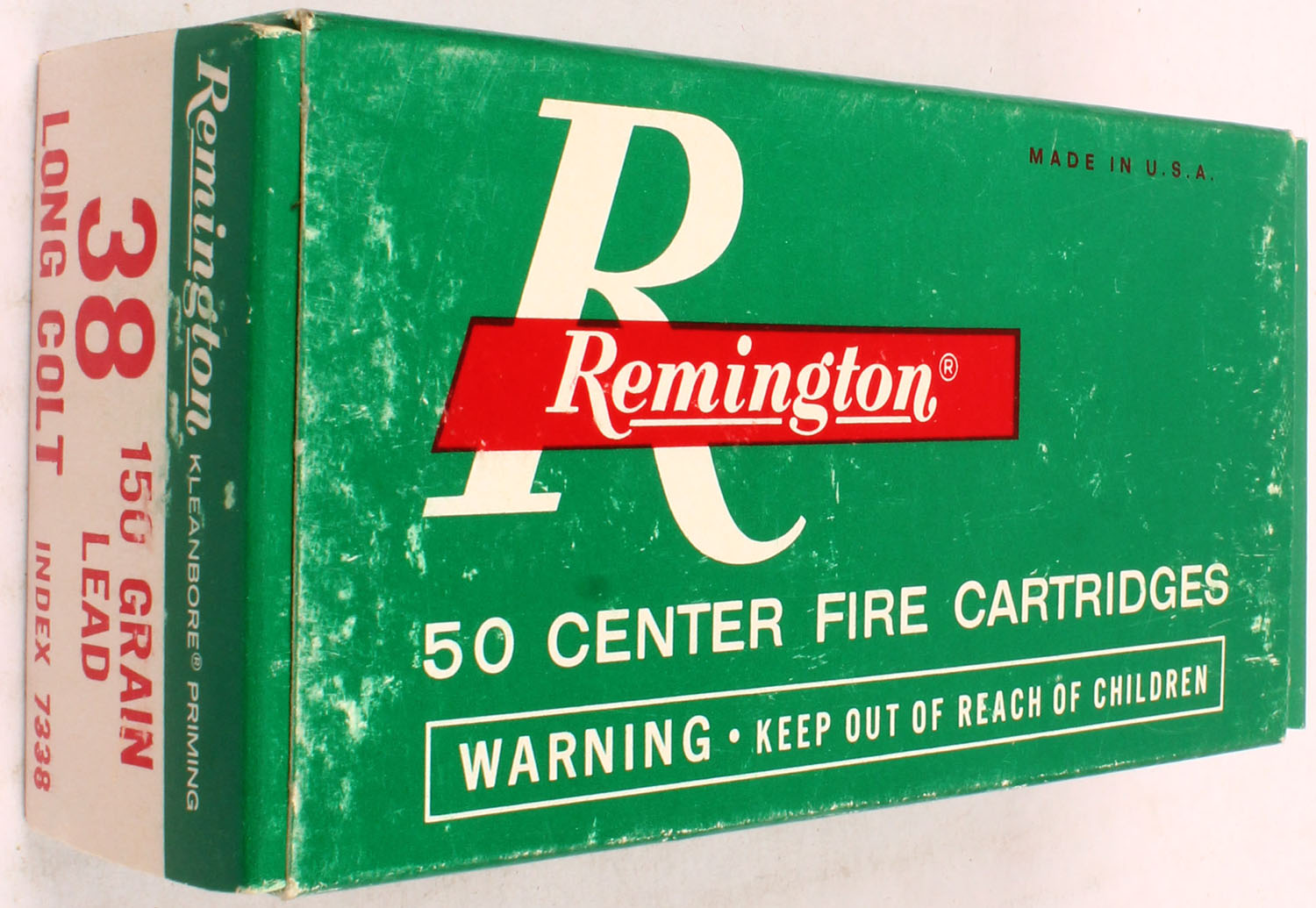 Remington, .38 Long Colt, 150 Gr. Lead Bullet, 1pc, Full, Green/white box with red/white print, box is solid with rub marks, ammo is excellent. Grade: Excellent - Value: 40 to 80