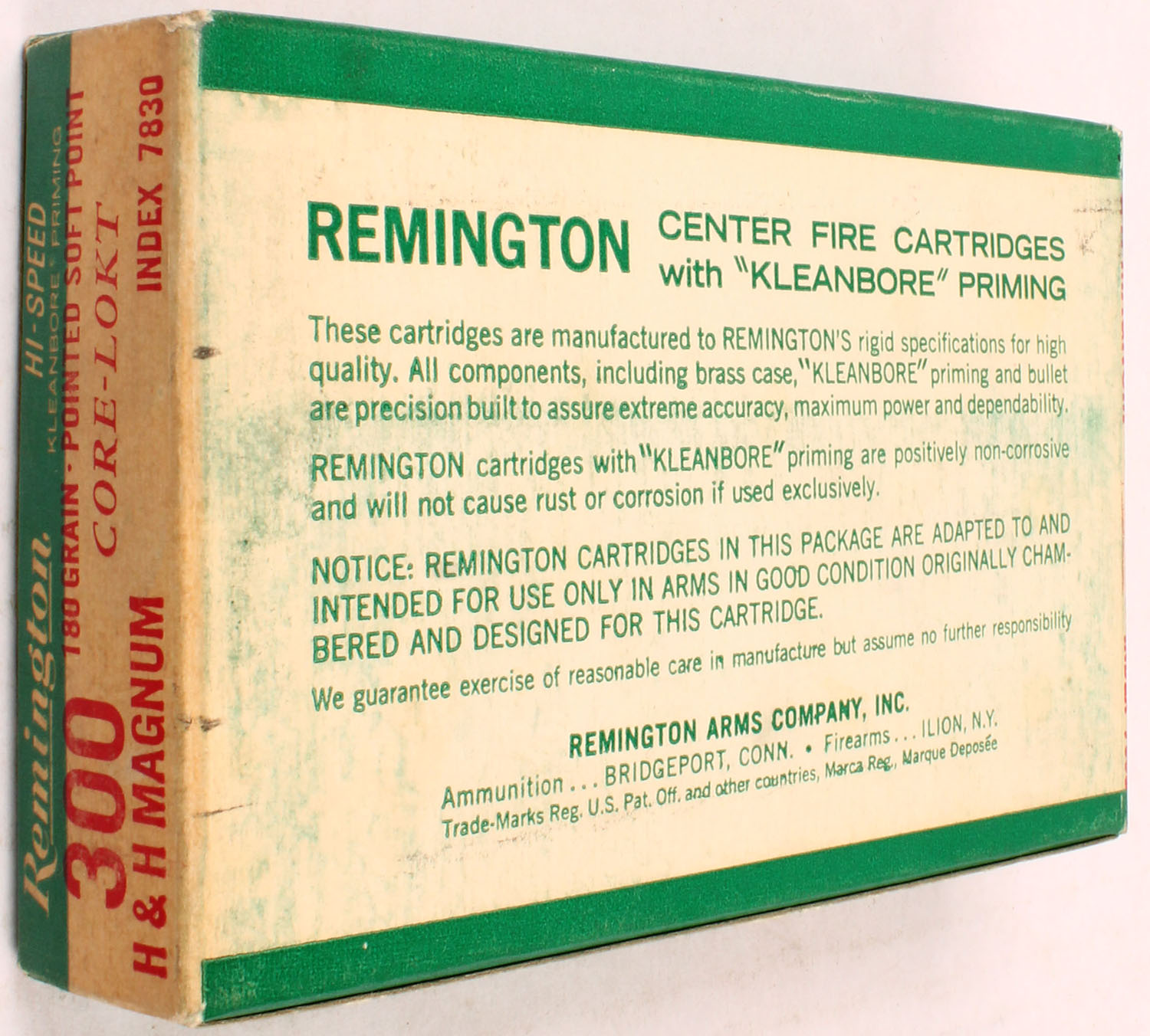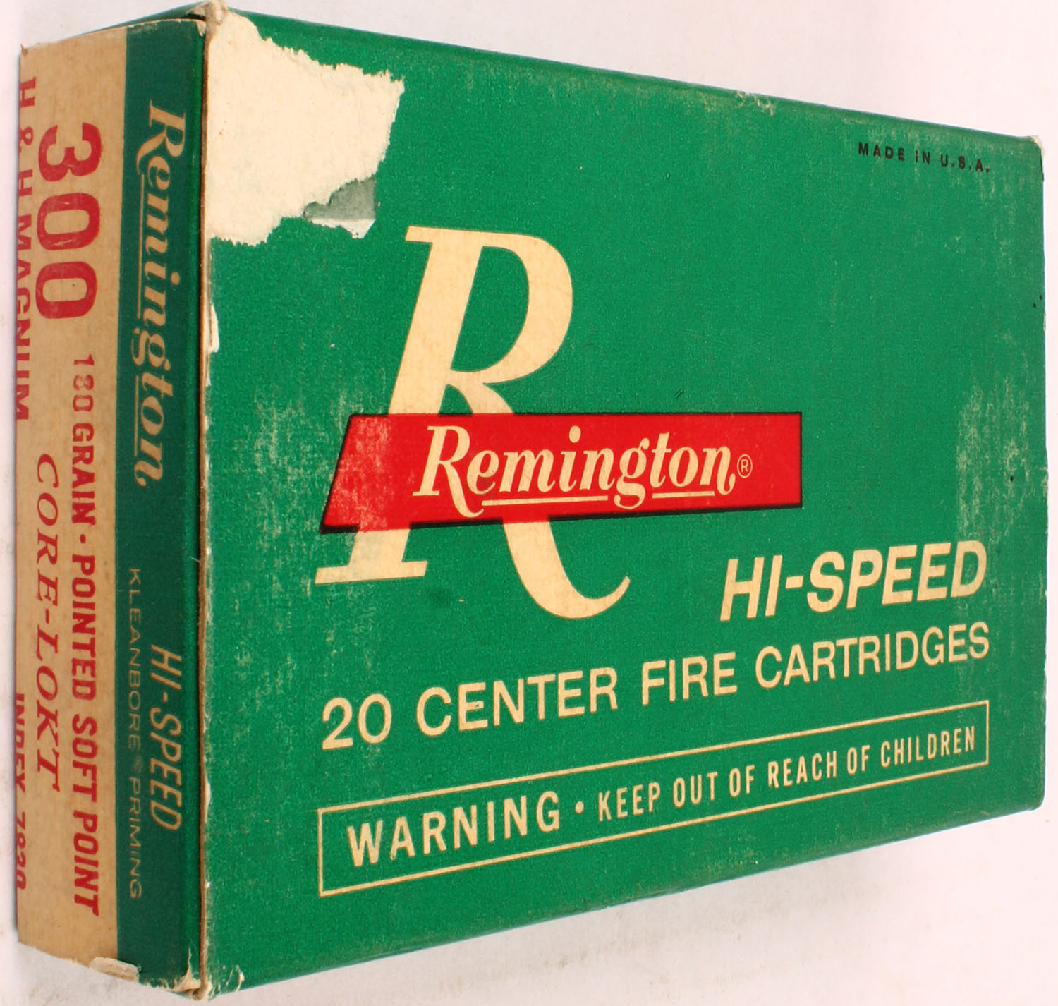 Remington, .300 H&H Mag Hi-Speed, 180 Gr. Pointed Soft point Core-Lokt Bullet, 1pc, Full, Green/white box with red/white print, box is solid with rub marks, & sticker tear spot, ammo is excellent. Grade: Very Good ++ - Value: 40 to 80