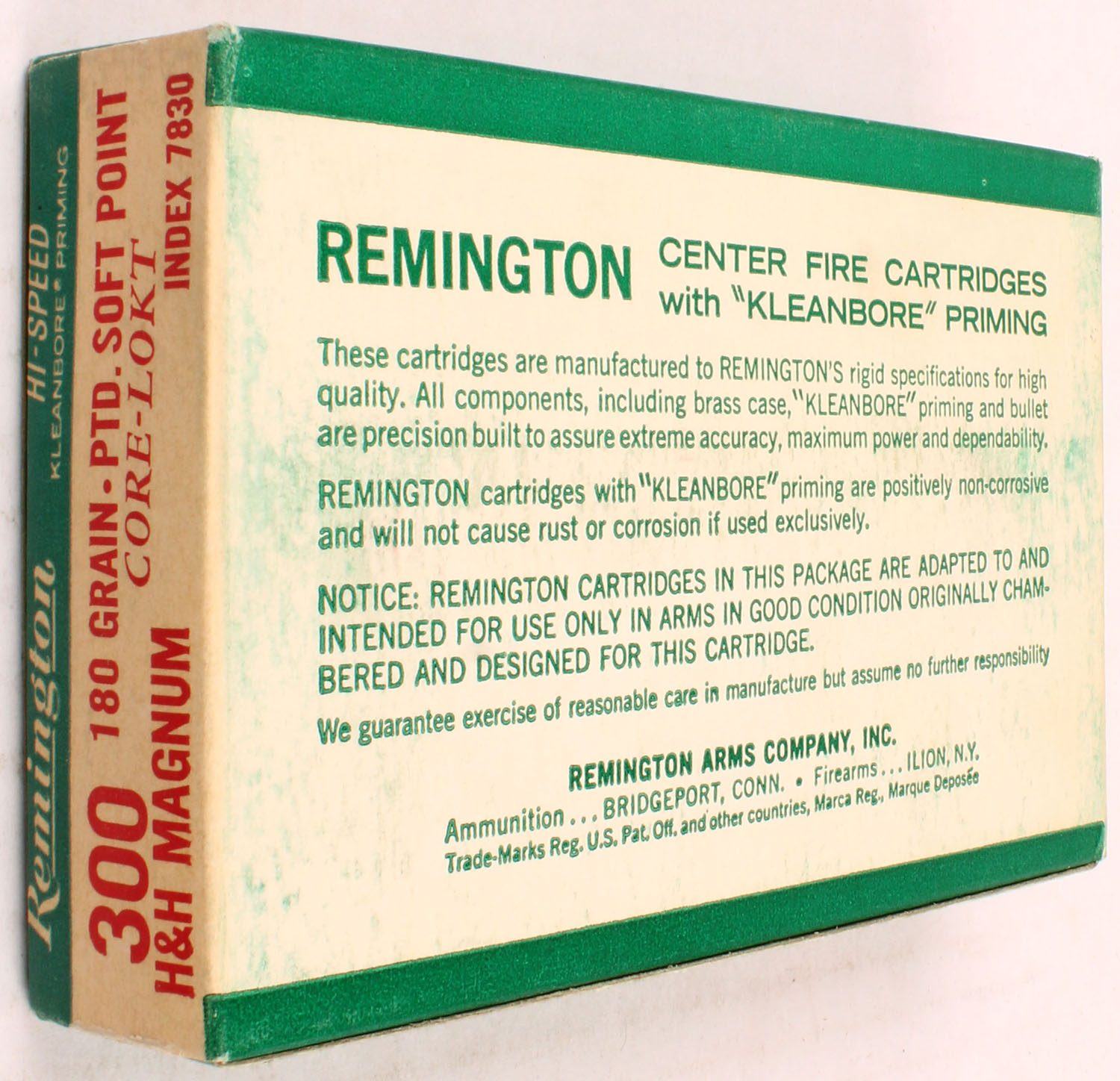 Remington, .300 H&H Mag Hi-Speed, 180 Gr. Pointed Soft point Core-Lokt Bullet, 1pc, Full, Green/white box with red/white print, box is solid with rub marks, & sticker tear spot, ammo is excellent. Grade: Very Good ++ - Value: 40 to 80