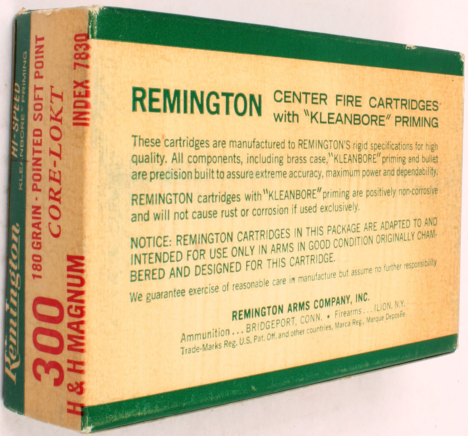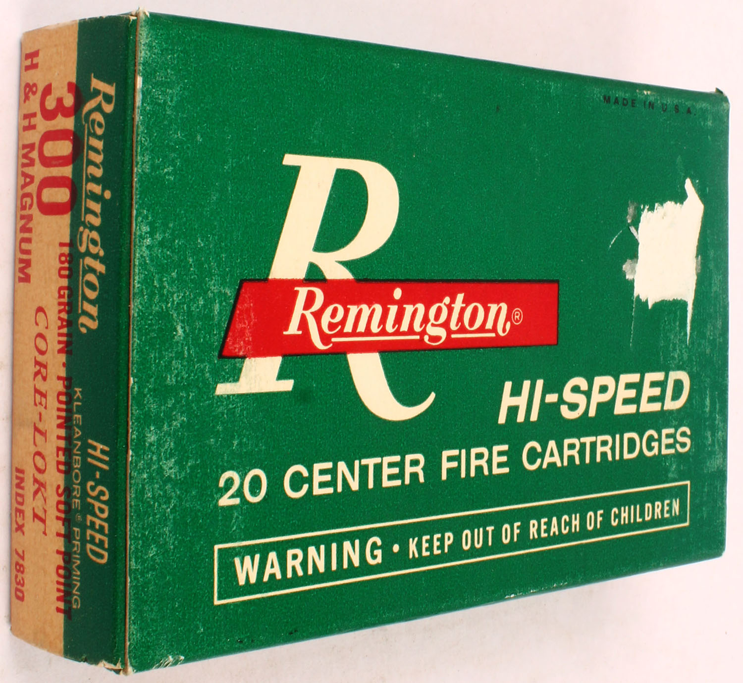 Remington, .300 H&H Mag Hi-Speed, 180 Gr. Pointed Soft point Core-Lokt Bullet, 1pc, Full, Green/white box with red/white print, box is solid with rub marks, & sticker tear spot, ammo is excellent. Grade: Very Good ++ - Value: 40 to 80