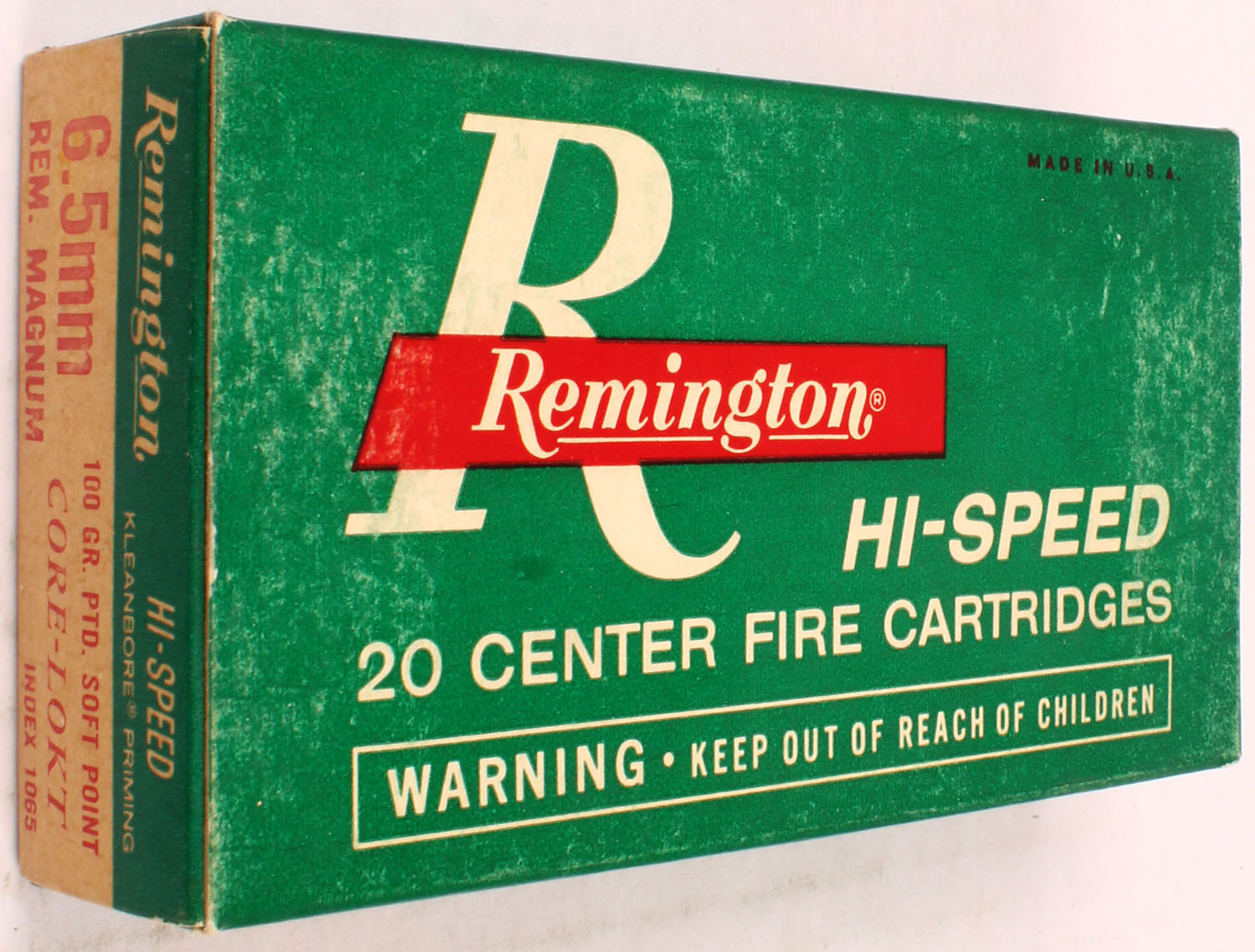 Remington, 6.5 Rem. Magnum Hi-Speed, 100 Gr. Pointed Soft point Core-Lokt Bullet, 1pc, Full, Green/white box with red/white print, box is solid with rub marks, label tears marks, & tape, ammo is excellent. Grade: Very Good + - Value: 30 to 60