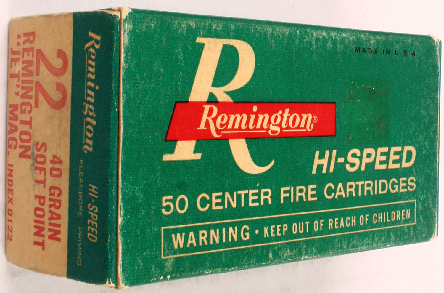 Remington, .22 Rem Jet Mag Hi-Speed, 40 Gr. Soft point Bullet, 1pc, Full, Green/white box with red/white print, box is solid with rub marks, pen marks, tape marks, ammo is excellent. Grade: Very Good ++ - Value: 60 to 120