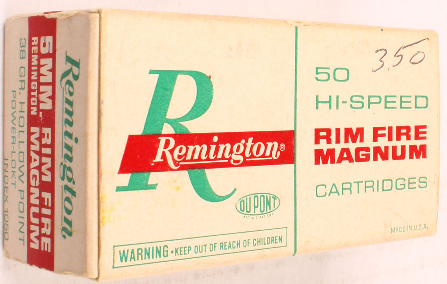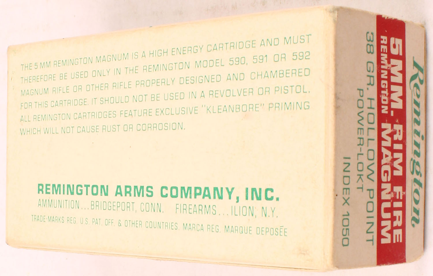 Remington, 5MM Remington Rim Fire Mag Hi-Speed, 38 Gr. Hollow PT. Power-Lokt Bullet, 1pc, Partial 44 Rds., white box with red/green print, box is solid with, ammo is excellent. Grade: Very Good ++ - Value: 30 to 60