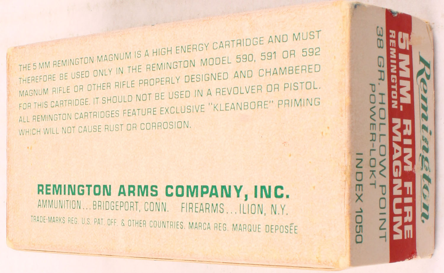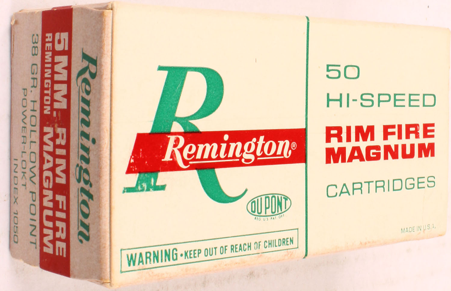 Remington, 5MM Remington Rim Fire Mag Hi-Speed, 38 Gr. Hollow PT. Power-Lokt Bullet, 1pc, Full, white box with red/green print, box is solid with, ammo is excellent. Grade: Very Good ++ - Value: 30 to 100