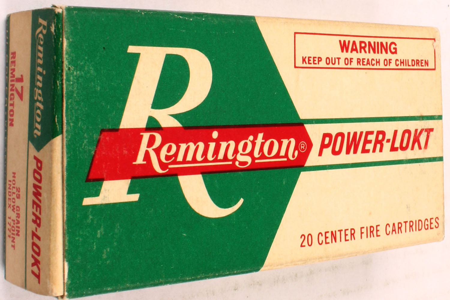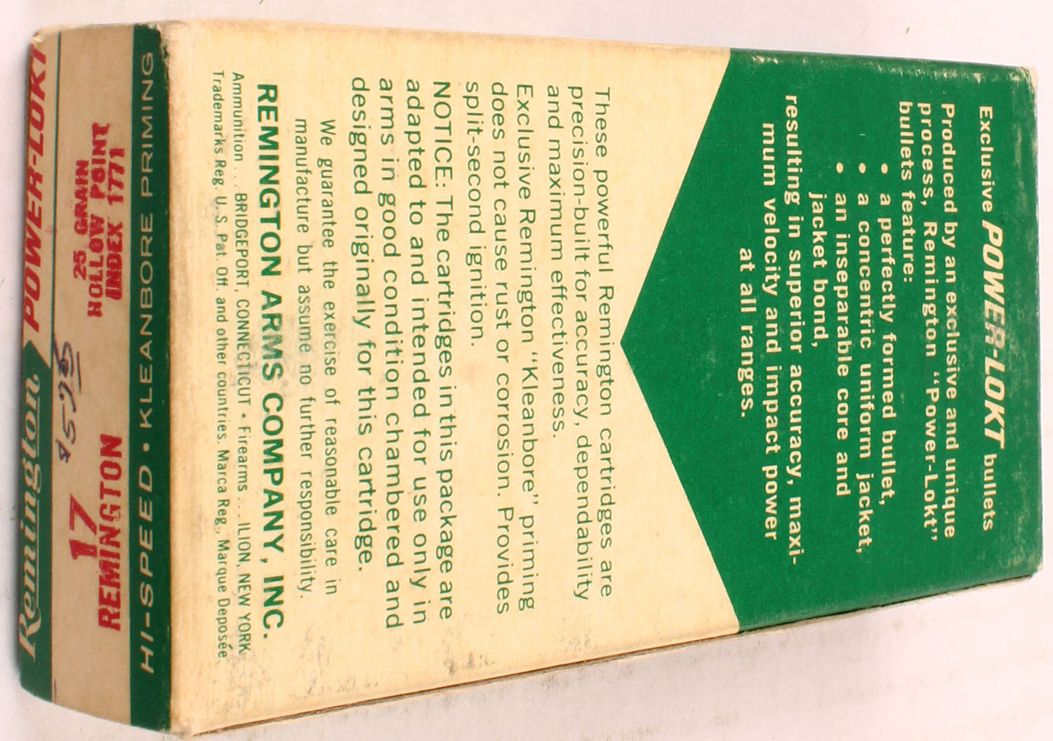 Remington, .17 Remington Power-Lokt, 25 Gr. Hollow Point Bullet, 1pc, Full, white box with red/green print, box is solid with rub wear, ammo is excellent. Grade: Very Good ++ - Value: 30 to 60