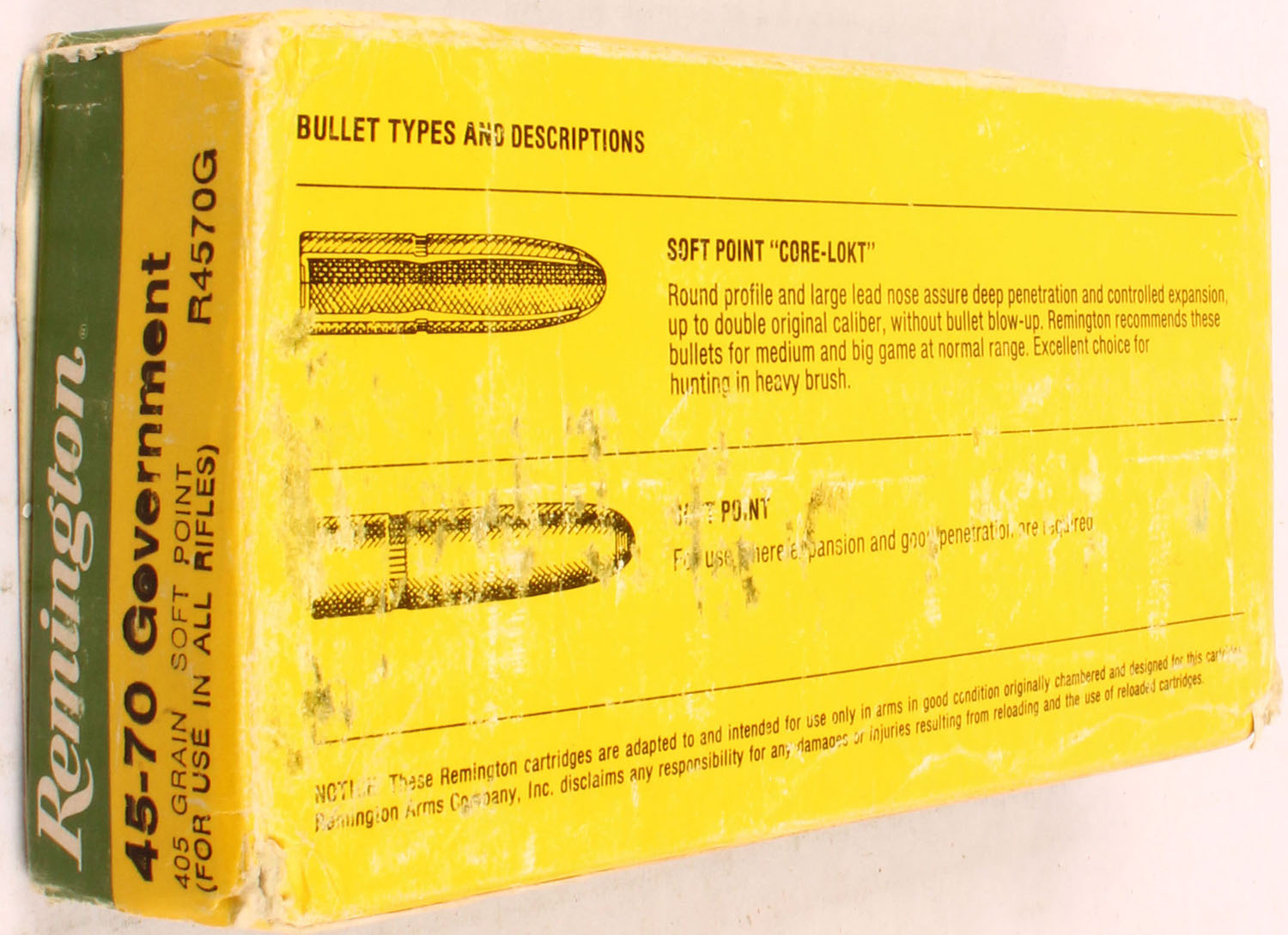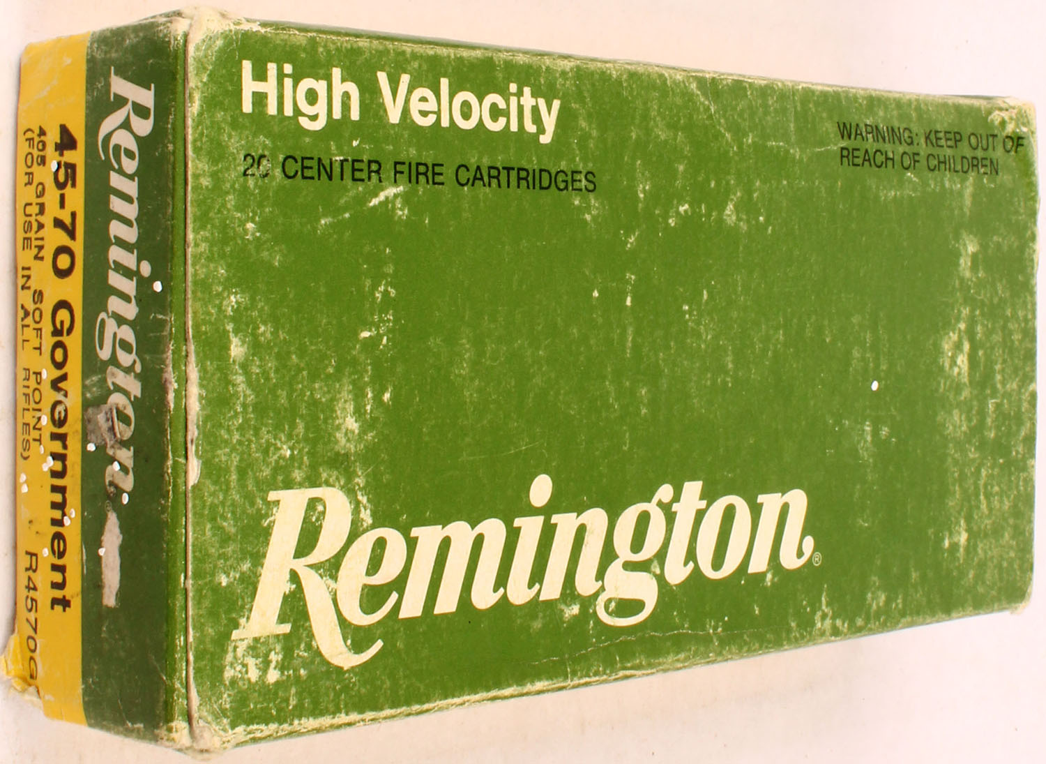 Remington, High Velocity, .45-70 Government, 405 Gr. Soft Point, 1pc, Full, green/yellow box with white/black print, box is solid with rub wear & handling wear, ammo is excellent. Grade: Very Good ++ - Value: 30 to 60