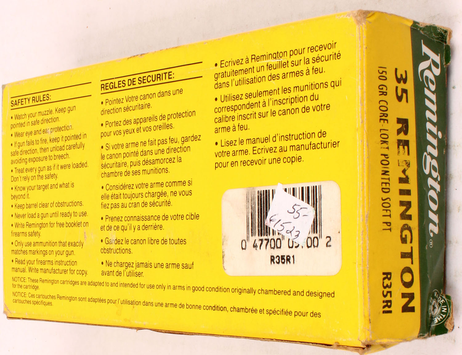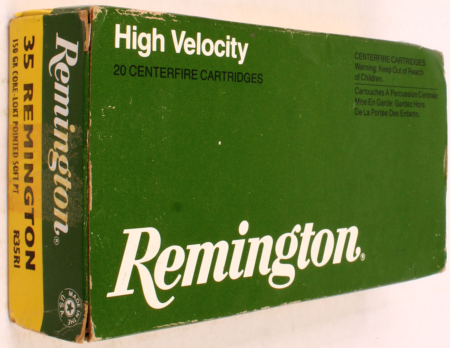 Remington, High Velocity, .35 Remington, 150 Gr. Core Lokt Pointed Soft Point, 1pc, Full, green/yellow box with white/black print, box is solid with rub wear, handling wear, stickers, & edge wear, ammo is very good. Grade: Very Good + - Value: 50 to 100