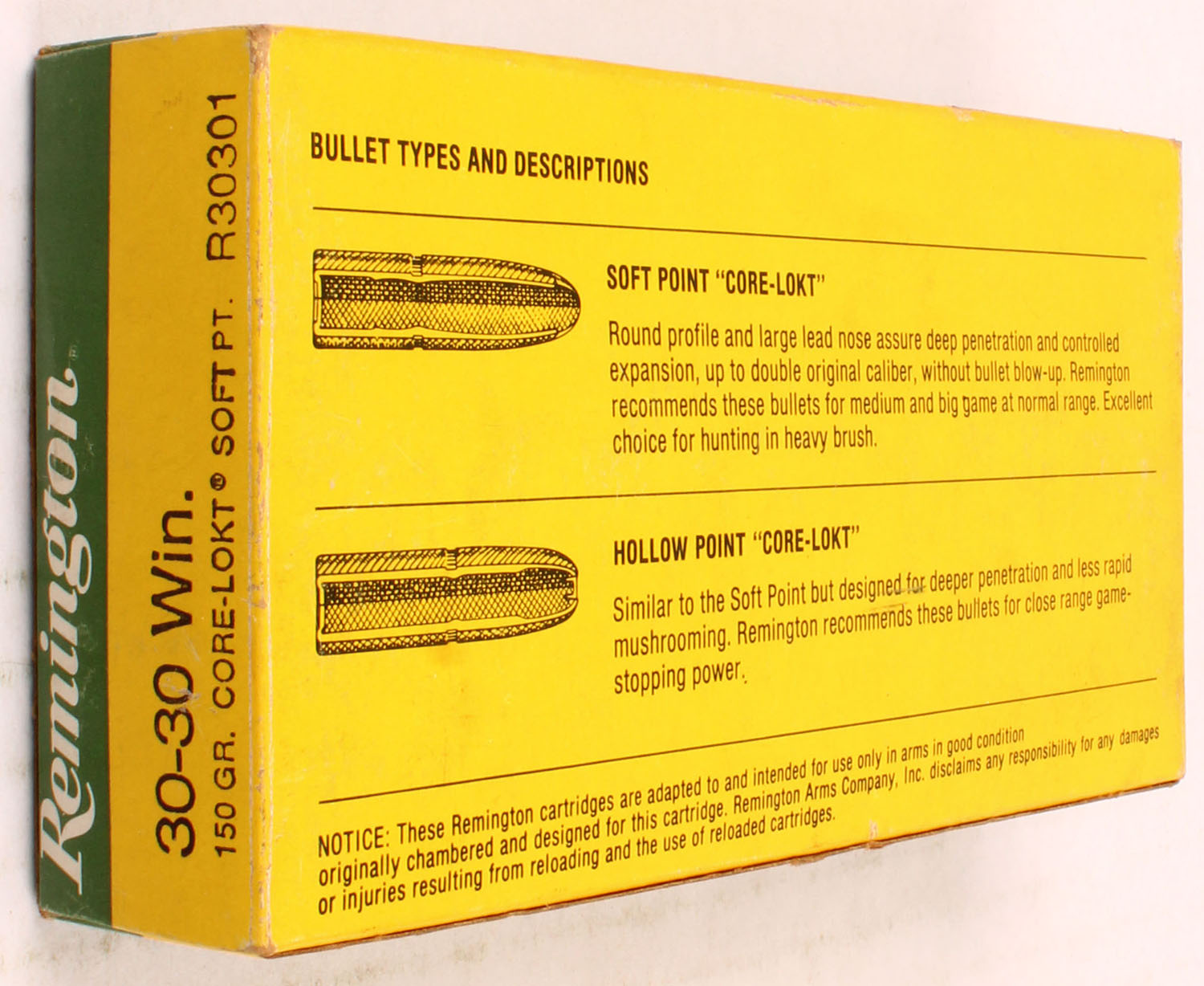 Remington, High Velocity, .30-30 Win., 150 Gr. Soft Point Core-Lokt, 1pc, Full, green/yellow box with white/black print, box is solid with rub marks, & stains, ammo is Excellent. Grade: Very Good + - Value: 30 to 60