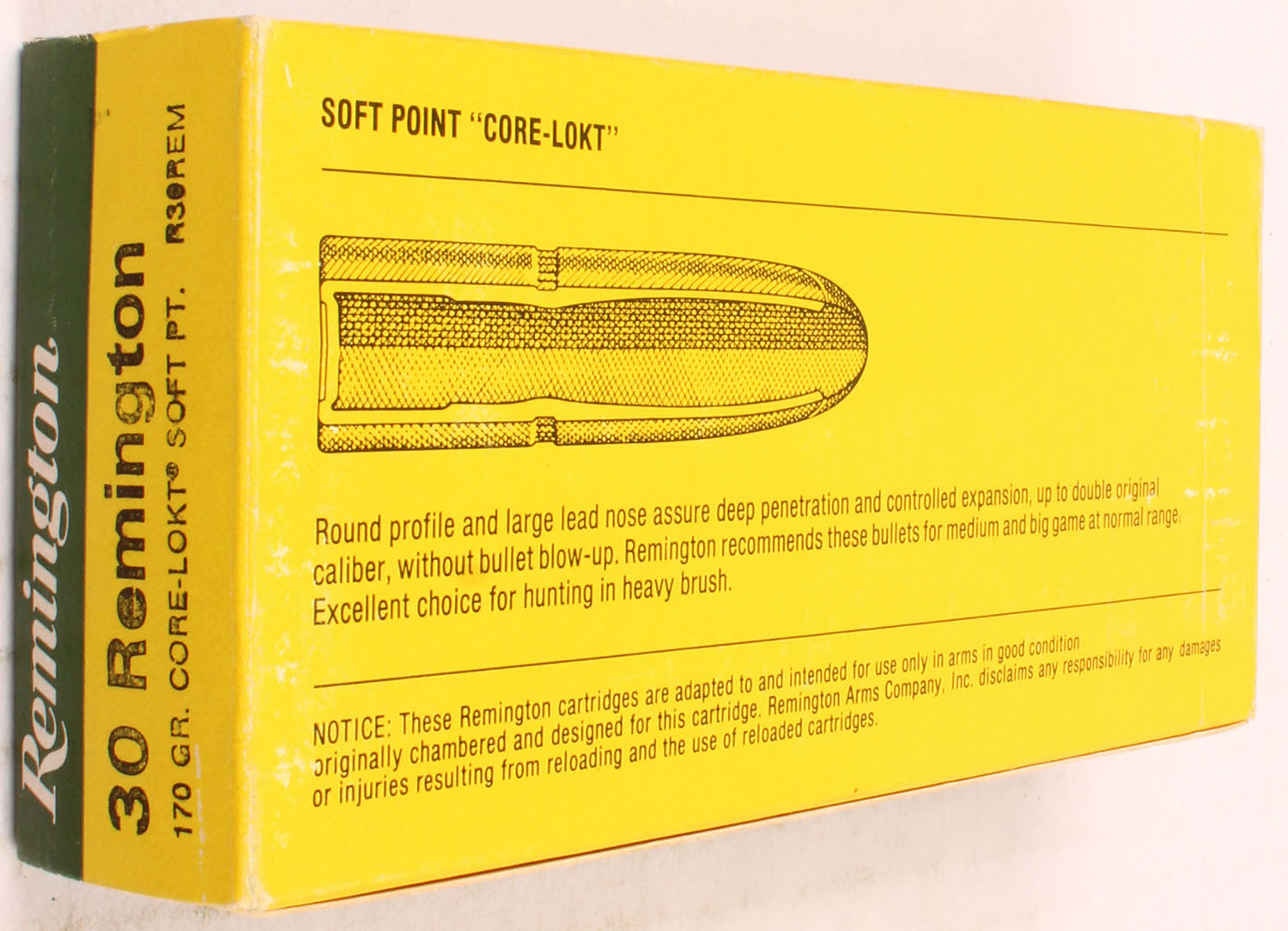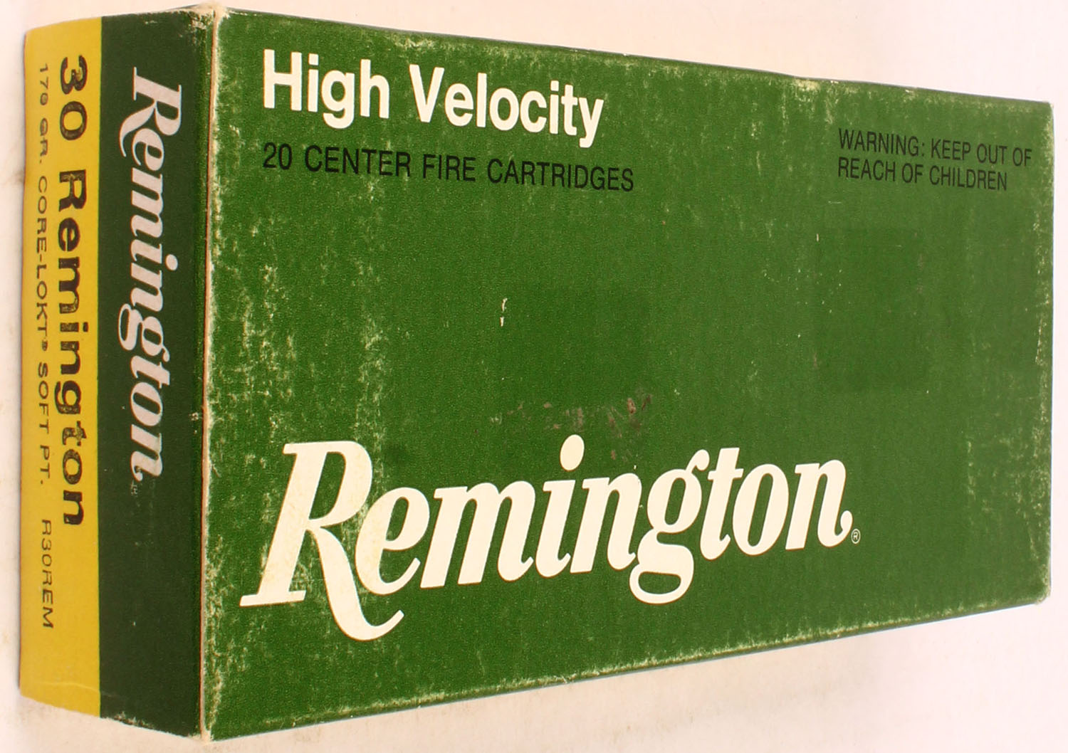 Remington, High Velocity, .30 Remington, 170 Gr. Soft Point Core-Lokt Bullet, 1pc, Full, green/yellow box with white/black print, box is solid with rub marks, ammo is Excellent. Grade: Excellent - Value: 30 to 60