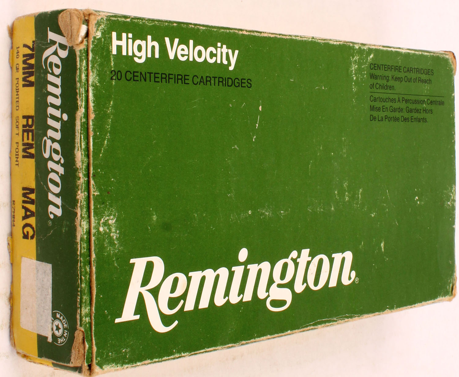 Remington, High Velocity, 7mm Rem Mag, 140 Gr. PTD soft point bullet, 1pc, Full, green/yellow box with white/black print, box is solid with rub marks, ammo is Excellent. Grade: Excellent - Value: 30 to 60