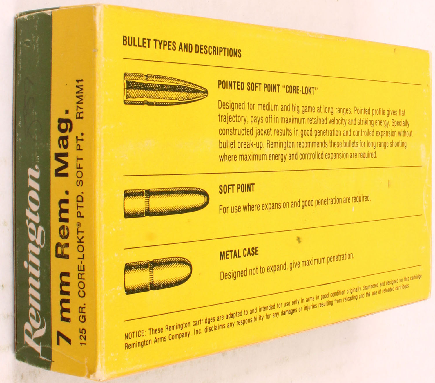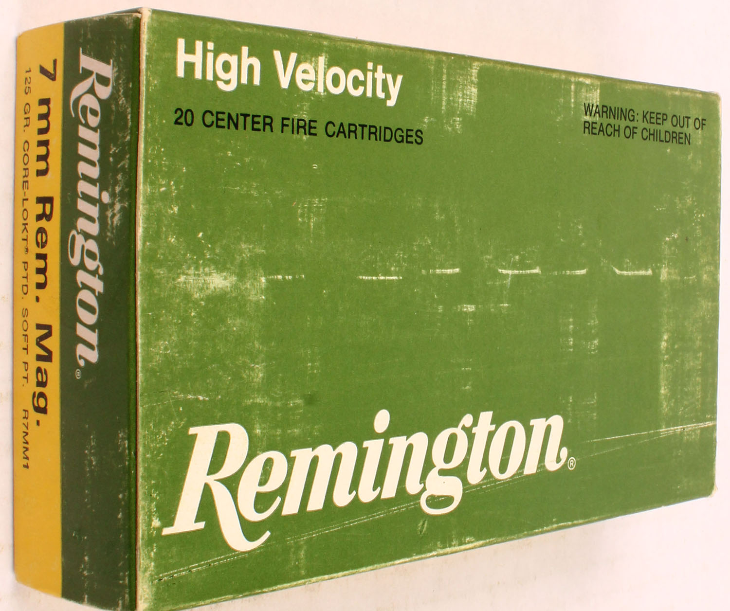 Remington, High Velocity, 7mm Rem Mag, 125 Gr. Core-Lokt PTD soft point Bullet, 1pc, Full, green/yellow box with white/black print, box is solid with rub marks, ammo is Excellent. Grade: Excellent - Value: 30 to 60
